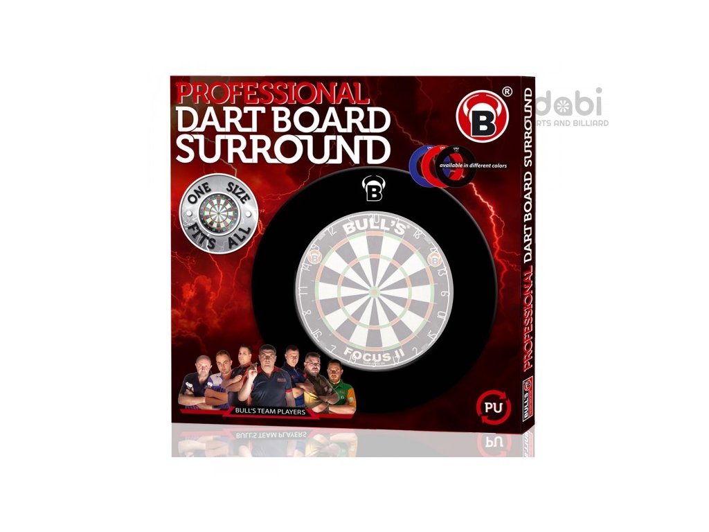 Profesionální PU BULL'S surround, neboli okruží má tloušťku přibližně 3,5 cm. Materiál PU minimalizuje počet pádů šipek, což chrání šipky i podlahu. Nový vylepšený tvar s vnitřním průměrem přibližně 45 cm se perfektně hodí na většinu běžně dostupných sisalových terčů. Šířka ochranného okruží je cca 12 cm, což poskytuje dostatečnou ochranu stěny a to i pro nezkušené hráče šipek.