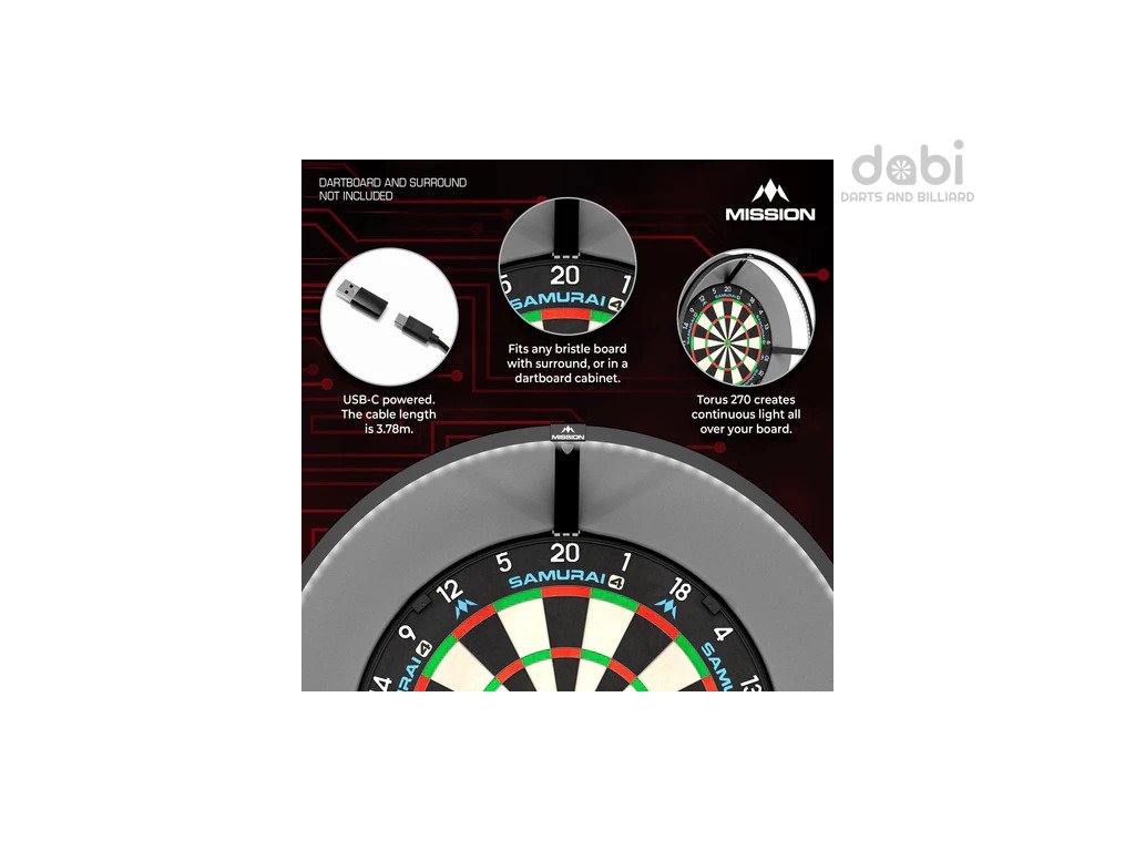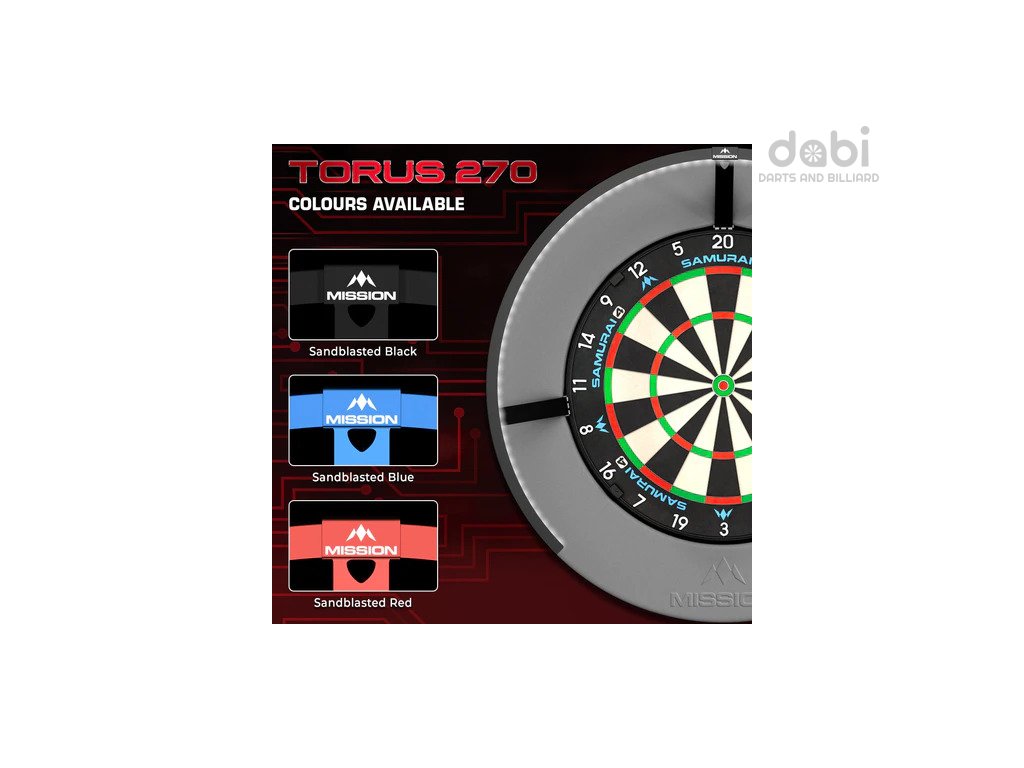 Toto osvětlení si zachovává svůj jedinečný úhel 270 stupňů, ale nyní je vybaven skládacím systémem nohou, který nevyžaduje žádné šrouby, takže je jeho instalace ještě jednodušší než dříve. Torus 270 je k dispozici ve třech různých barvách (černá, modrá nebo červená) a dokáže osvětlit jakýkoli sisalový terč jasnými bílými LED diodami, které na terč nevrhají stíny a odlesky. Torus 270 je lehké a přenosné řešení, protože se dá složit do malého rozměru, když