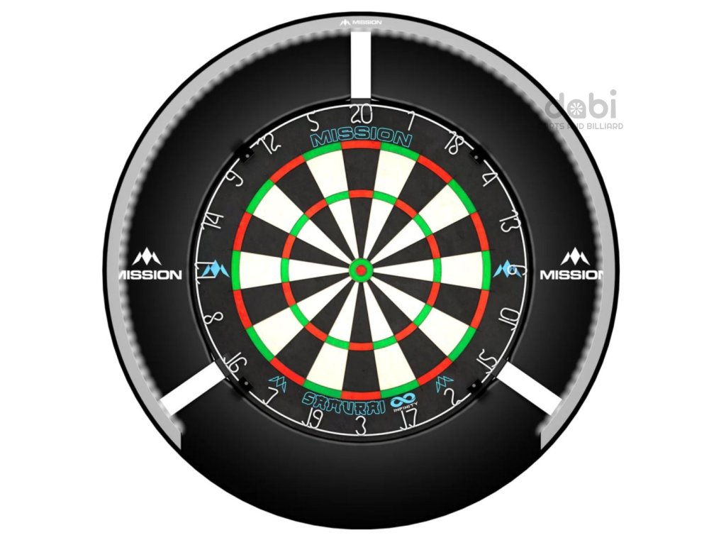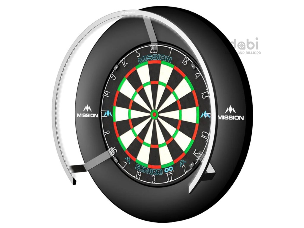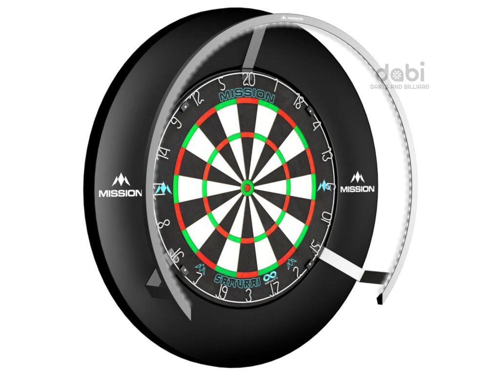 Mission Torus 270 je nové unikátní osvětlení sisalového terče, díky kterému dosáhnete ještě lepších výkonů. Jedinečný design 270 stupňů. Osvětlení je vyrobeno z lehkého hliníku a hodí se na všechny sisalové terče. A protože upínací klipy se pevně připnou na terč, nedochází k žádnému pohybu. Unikátní designová lišta je nakloněna o 25°, aby šlo na terč ještě více světla, a co je důležité, tak neoslňuje hráče. Dodává světlo přesně tam, kde potřebujete, bez bočního oslnění a bez stínů. Osvětlení je dodáváno s univerzálním adaptérem.