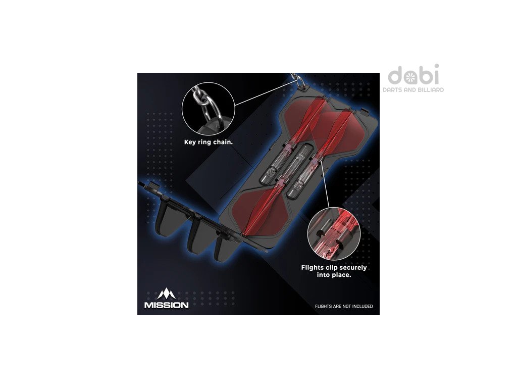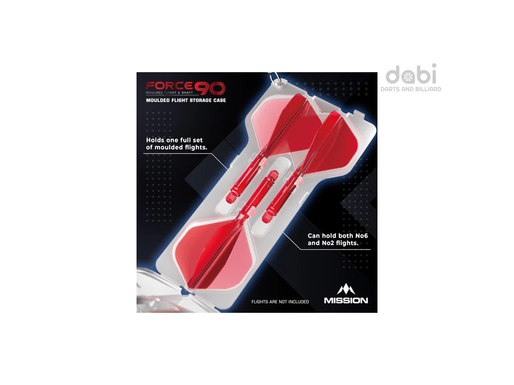 Uložte si své náhradní kompaktní letky v bezpečí v lisovaném pouzdře Mission Force 90. Toto pouzdro bylo navrženo tak, aby pojalo celou sadu letek. Lze jej také použít k bezpečnému uložení jakéhokoli integrovaného systému letek. Pouzdro je k dispozici ve dvou různých barvách (průhledná bílá a černá) a dodává se s kroužkem na klíče, takže jej lze připevnit k pouzdru na šipky. Na přední straně pouzdra je logo Mission.