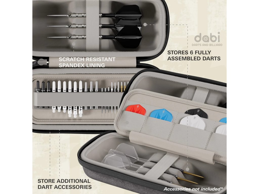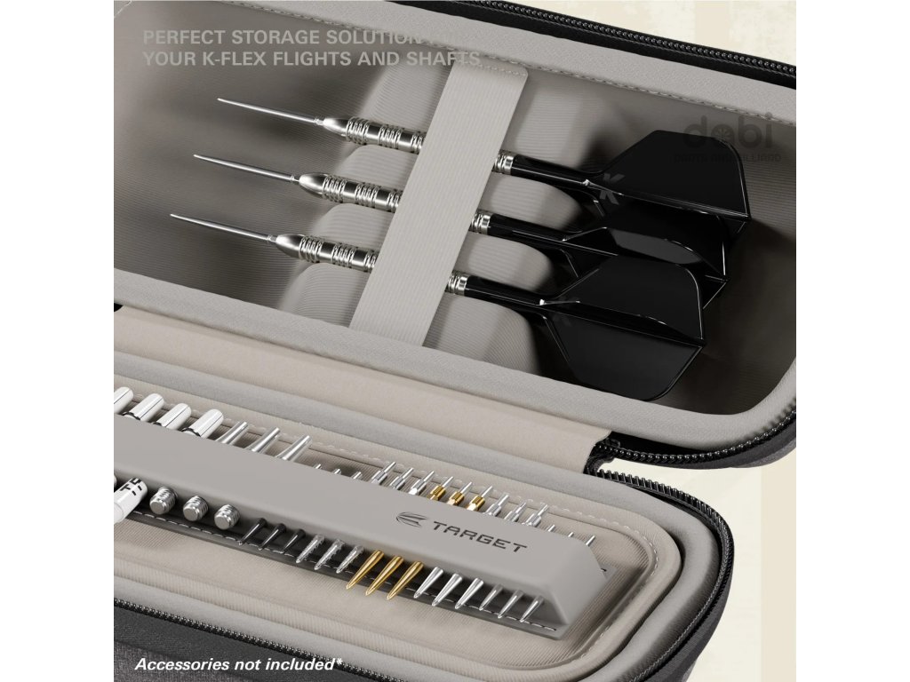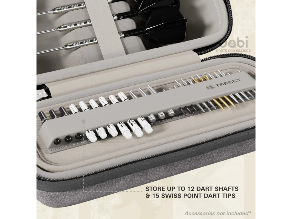 Pouzdro pohodlně pojme až 6 plně sestavených šipek. Vnitřní systém přihrádek umožňuje uložení 12 násadek a 15 hrotů Swiss Point + další příslušenství