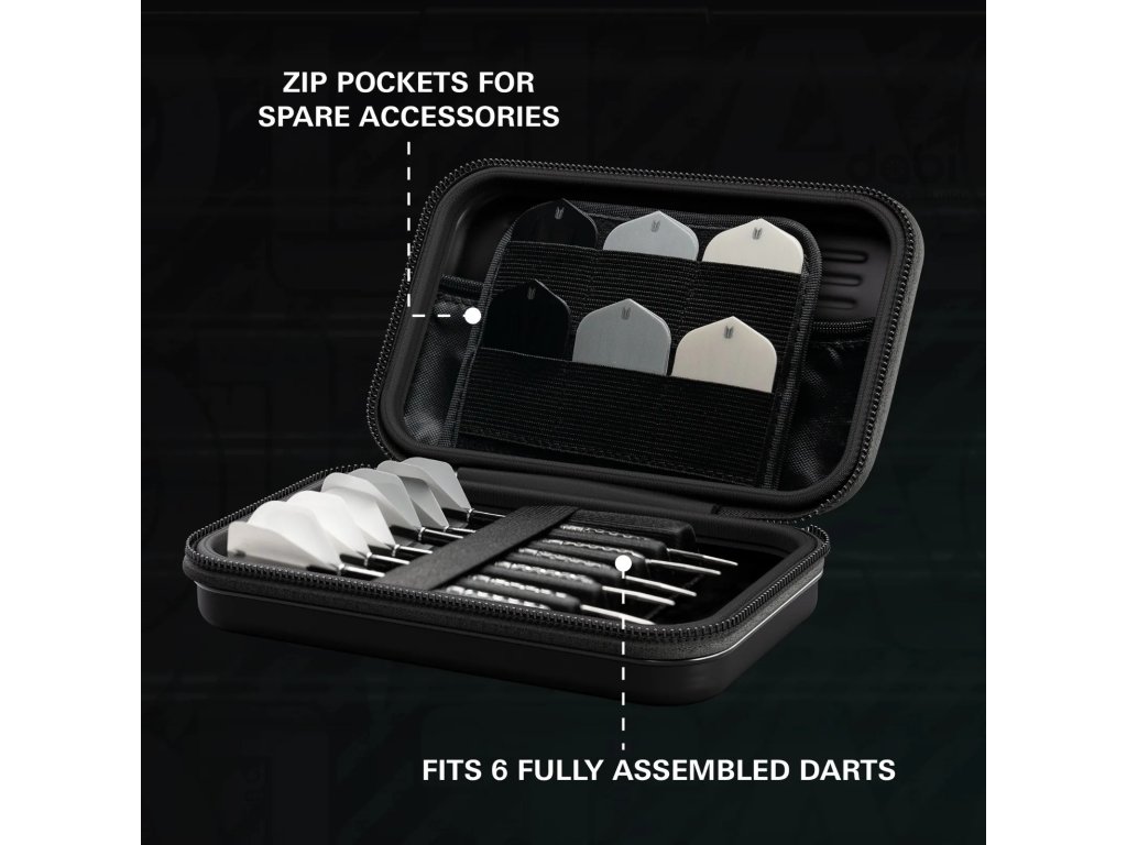 Pevné velké pouzdro na dvě sady šipek a spoustu příslušenství.