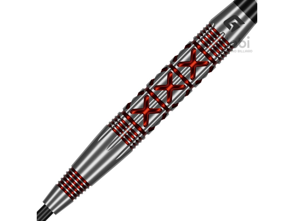 Rovný stříbrný barel je z 90% wolframu. V přední části má velmi jemné červené kroužky. Střední a zadní část barelu je zvýrazněna křížkovými a kroužkovými vzory v červené barvě. Logo GOAT je na úplném konci barelu.