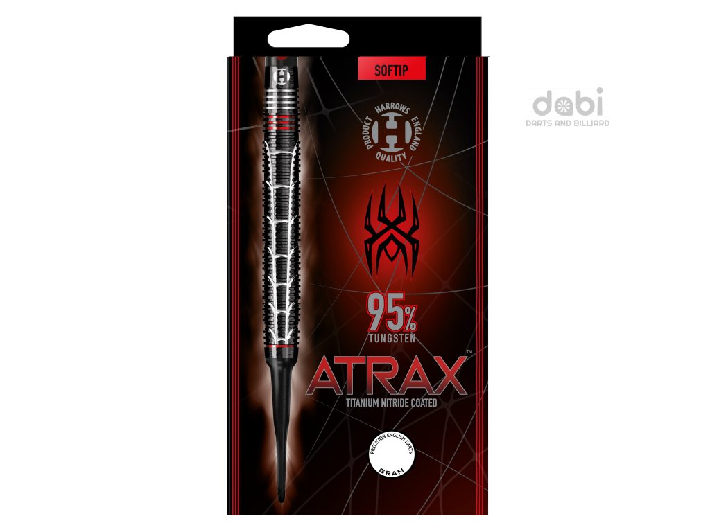 Šipky řady Atrax (pavouk z rodu sklípkanů) jsou frézovány na prvotřídních CNC strojích. Černá, odolná vrstva nitridu titanu spolu s metalickou červenou podporují podmanivý vzhled těchto šipek. Povrchová úprava odolným nitridem titanu a jedinečné pavučinové (síťové) frézování dělají z této šipky unikátní produkt.