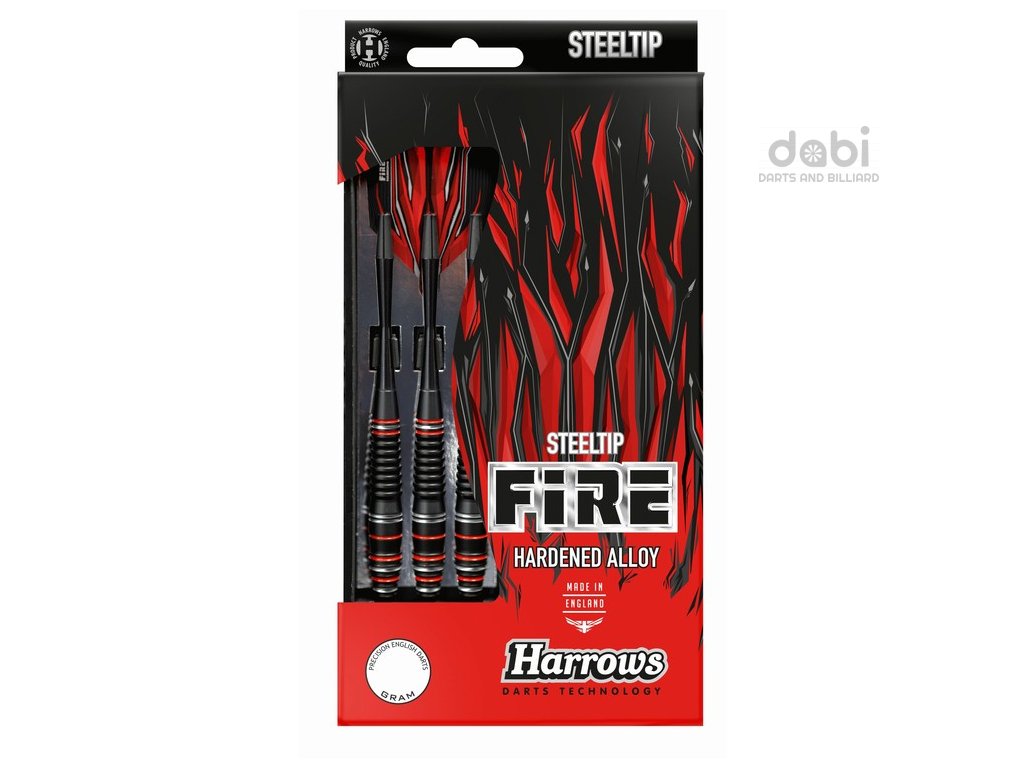 Šipky z vysoce kvalitní slitiny jsou nejnovějším přírůstkem Harrows do řady dynamických šipek. Kuželovitý barel se středovým vyvážením zdobí žraločí prstencové drážky, které poskytují optimální grip i nápadný vzhled.Šipky Fire High Grade Alloy, které jsou inspirované wolframovými šipkami Fire Inferno, mají odolnou černou povrchovou úpravu doplněnou výraznými stříbrnými a červenými prstenci. Šipky Fire High Grade Alloy jsou doplněny černými násadkami Speedline a letkami Fire.
