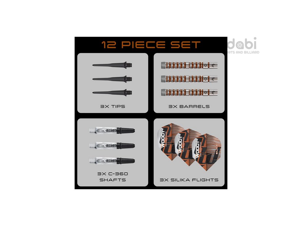Barely jsou vyrobeny z prémiového 90% wolframu a jsou opatřeny nápadným bronzovým povrchem v zářezech. Každá sada obsahuje krátké čiré násadky Carbon 360 a nové 100mikronové Silika letky s podpisem Lukea Woodhouse.