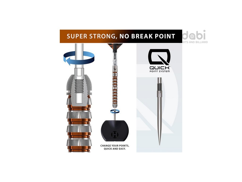 Hroty Quick Points jsou kompatibilní pouze s barely Harrows Quick Points a nelze je kombinovat s běžnými hroty pro nalisování ani s hroty se závitem 2BA.