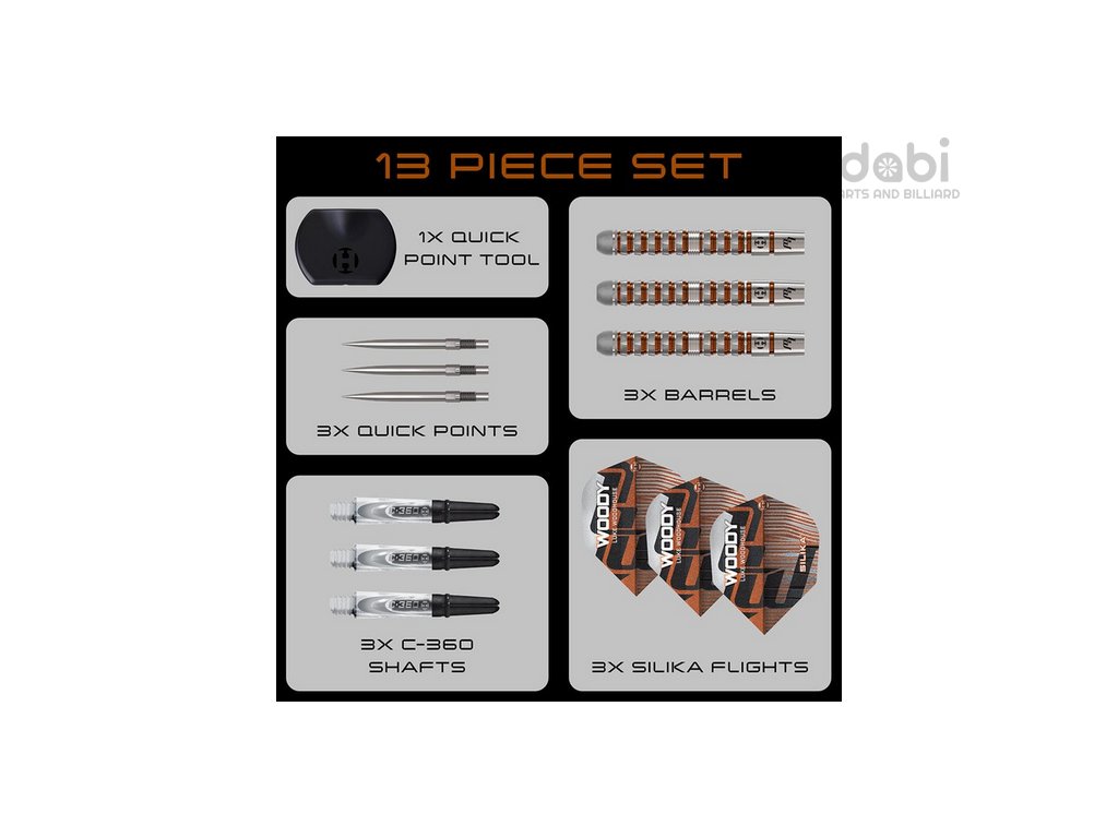 Barely jsou vyrobeny z prémiového 90% wolframu a jsou opatřeny nápadným bronzovým povrchem v zářezech. Každá sada obsahuje krátké čiré násadky Carbon 360 a nové 100mikronové Silika letky s podpisem Lukea Woodhouse.