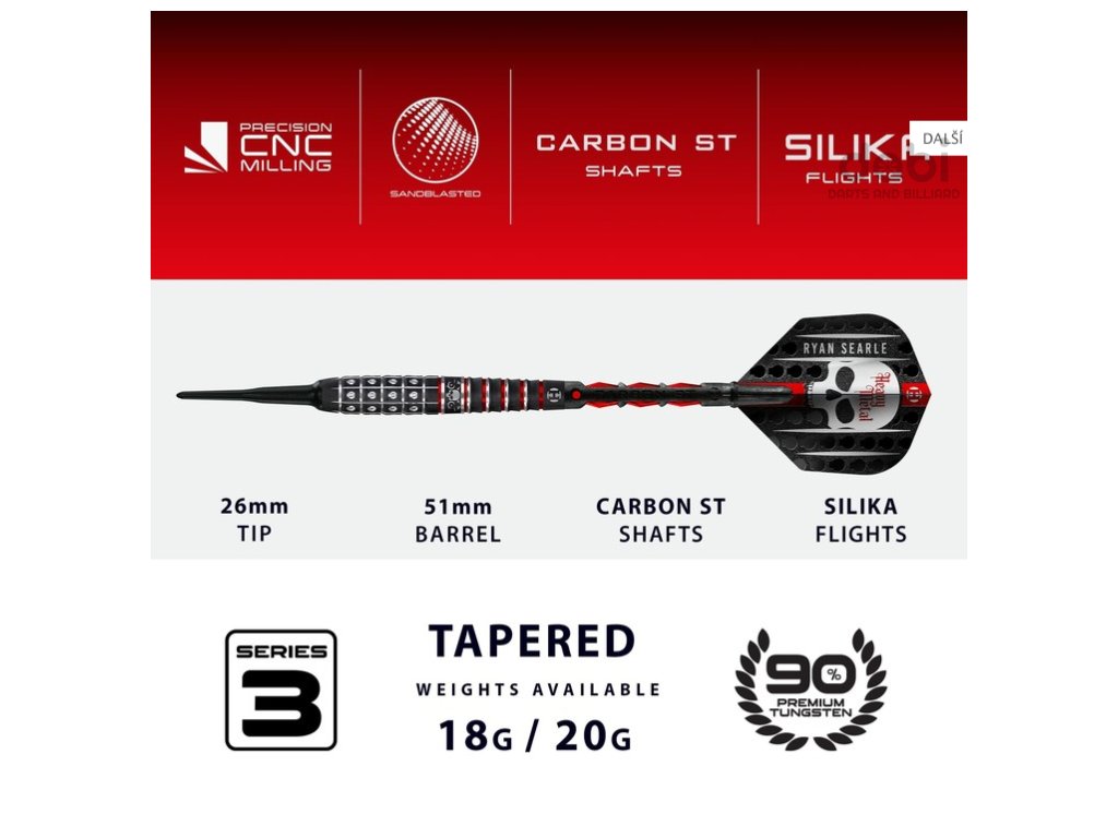 Série 3, navržená v úzké spolupráci s Ryanem „Heavy Metal“ Searlem, proslulým nejtěžšími šipkami na profesionálním okruhu, byla pečlivě vyrobena tak, aby poskytovala maximální jistotu a přesnost, a zároveň vystihla výraznou osobnost jednoho z nejznámějších hráčů současnosti.