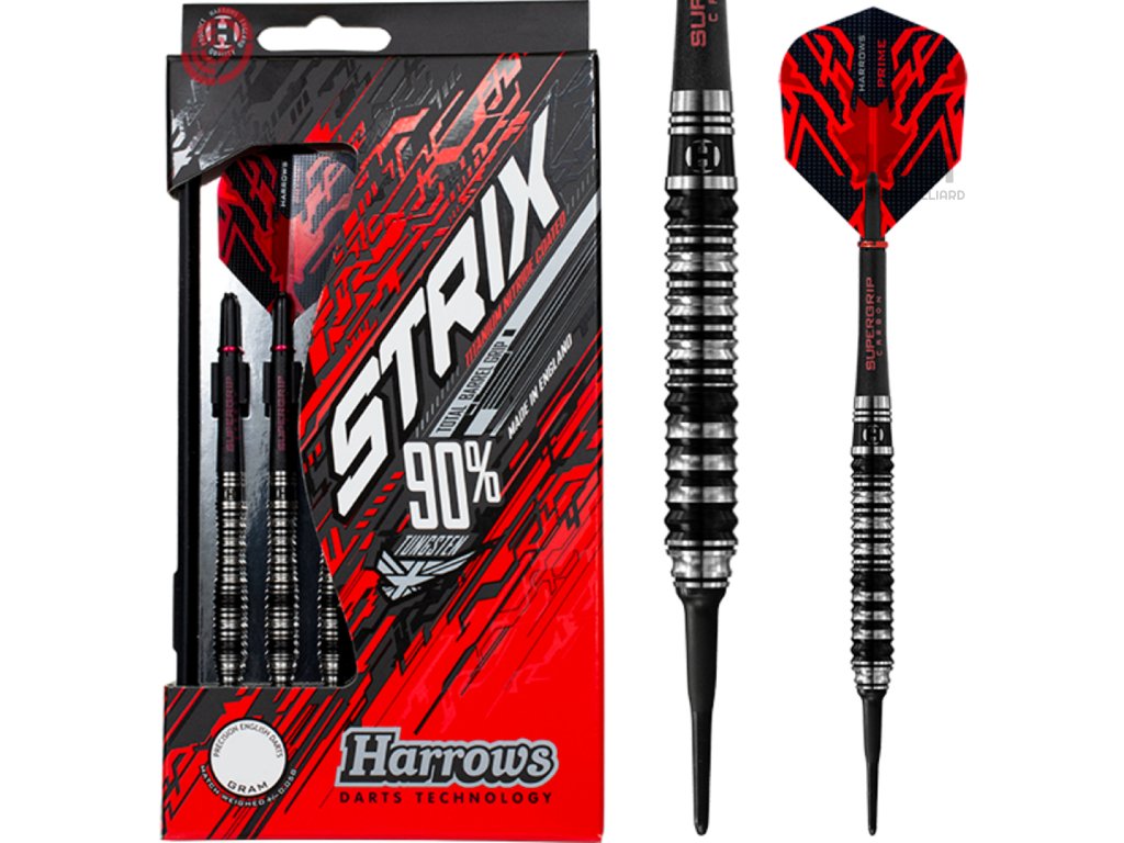 Exkuzivní šipky od firmy Harrows - Strix 90%. Při složitých obráběcích procesech je přesnost prvořadá. Jemné prstencové drážky šipek Strix, lišící se šířkou i hloubkou, byly vytvořeny na vysoce pokročilých CNC zařízeních, kterými disponuje centrála Harrows v Anglii. Důmyslný grip šipek Strix nabízí vynikající úchop, nehledě na to, kde hráč šipku drží.