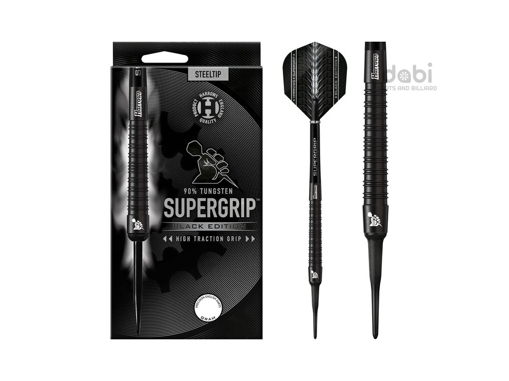 Šipky Supergrip vyrobené z 90% wolframu jsou designované na míru profesionálům, kteří vyžadují drsnější povrch, s ním dokáží lépe udržet konzistentnost svých odhozů. Model je doplněn násadkami Supergrip a černo-stříbrnými letkami Supergrip.