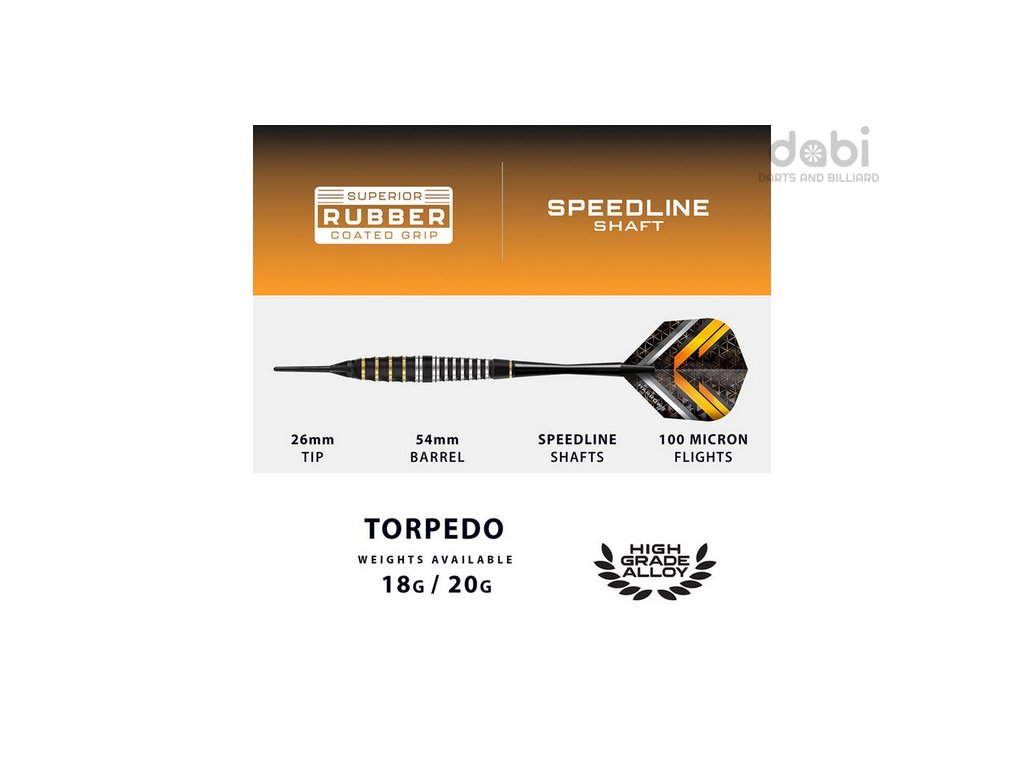 Barel šipky zaujme dvoubarevným černo-zlatým provedením. Vulkanizovaný gumový grip poskytuje pohodlný úchop, který neklouže, a pomáhá tak hráčům udržet stabilitu a soustředění při hodu.