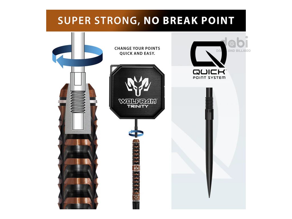 Začlenění technologie Harrows Quick Point posouvá Wolfram Trinity dále do moderní doby a umožňuje hráčům přizpůsobit si nastavení změnou stylu a délky hrotu během několika sekund, čímž se šipka přesně přizpůsobí podmínkám hodu.