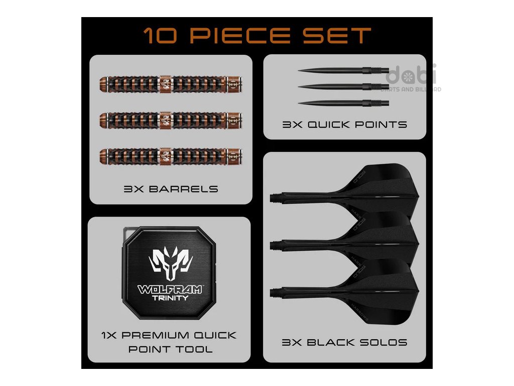 Wolfram Trinity jsou dodávány s hroty 26mm Quick Point (ocelový hrot), integrovanými násadkami s letkou Midi Black Solo a prémiovým nástrojem Wolfram Quick Point Tool, získáte tak kompletní prémiový set, připravený ke hře ihned po vybalení z krabice.