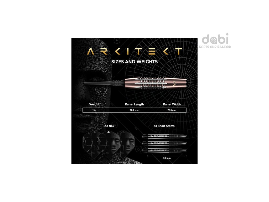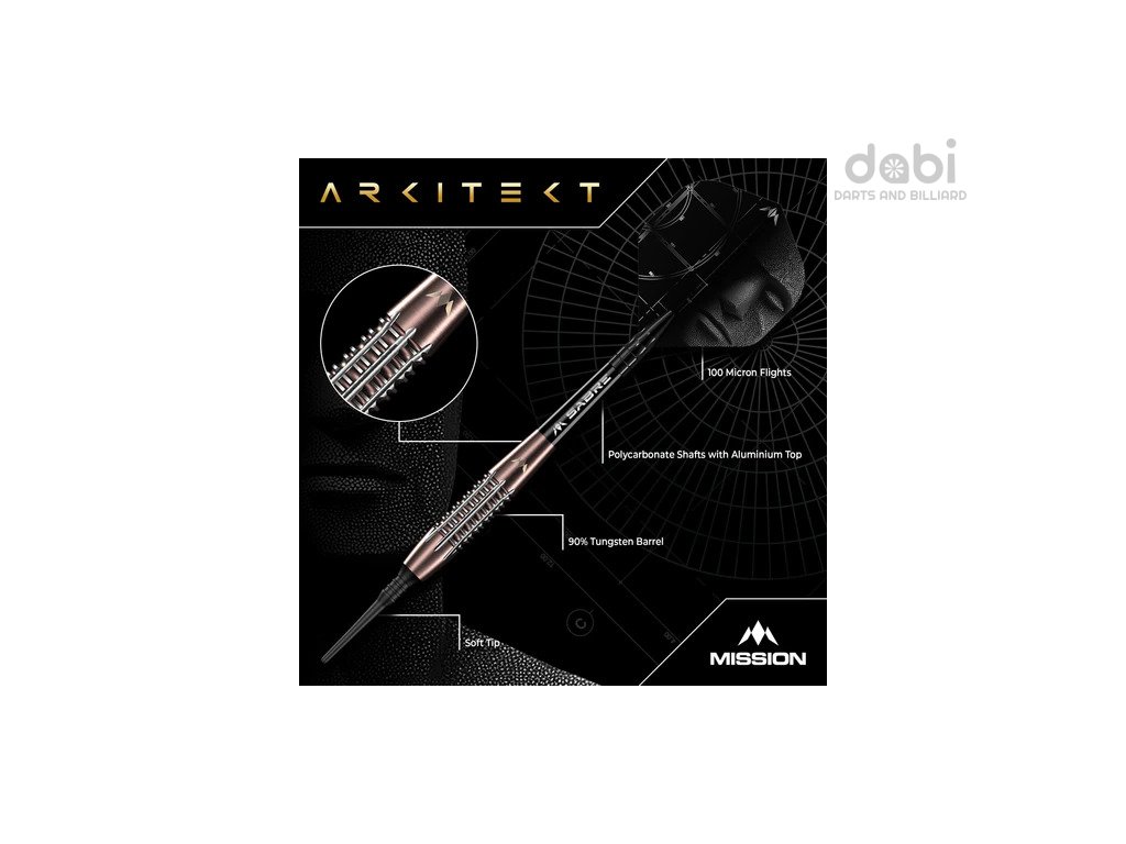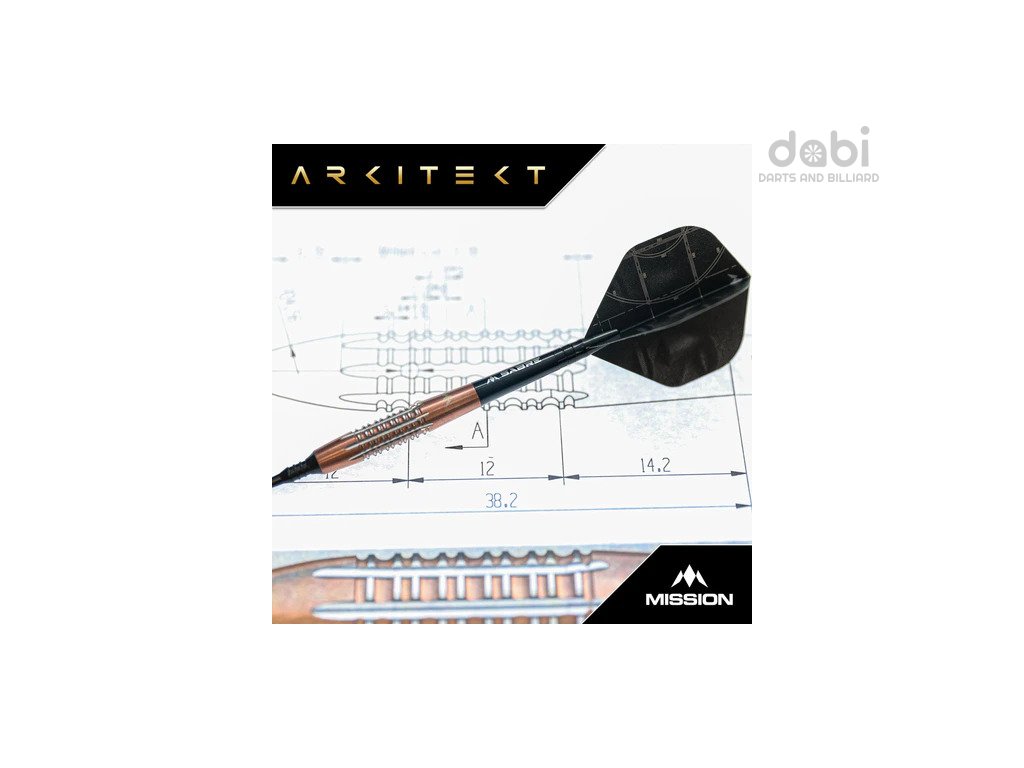 Šipky Mission Arkitekt jsou vyrobeny z 90% wolframu a mají bronzový PVD povlak barelu. Barel doutníkového tvaru měří 38,2 mm a je oblíbenou volbou designérů, kteří spolupracovali s některými z největších světových značek šipek. Střední část má radiální vzor s frézovanými výřezy pro lepší úchop. Hladkou zadní část zdobí laserem gravírované logo Mission.