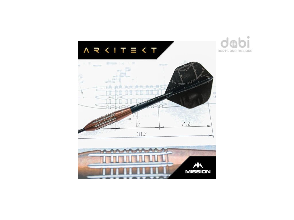 Šipky Mission Arkitekt jsou vyrobeny z 90% wolframu a mají bronzový PVD povlak barelu. Barel doutníkového tvaru měří 38,2 mm a je oblíbenou volbou designérů, kteří spolupracovali s některými z největších světových značek šipek. Střední část má radiální vzor s frézovanými výřezy pro lepší úchop. Hladkou zadní část zdobí laserem gravírované logo Mission.