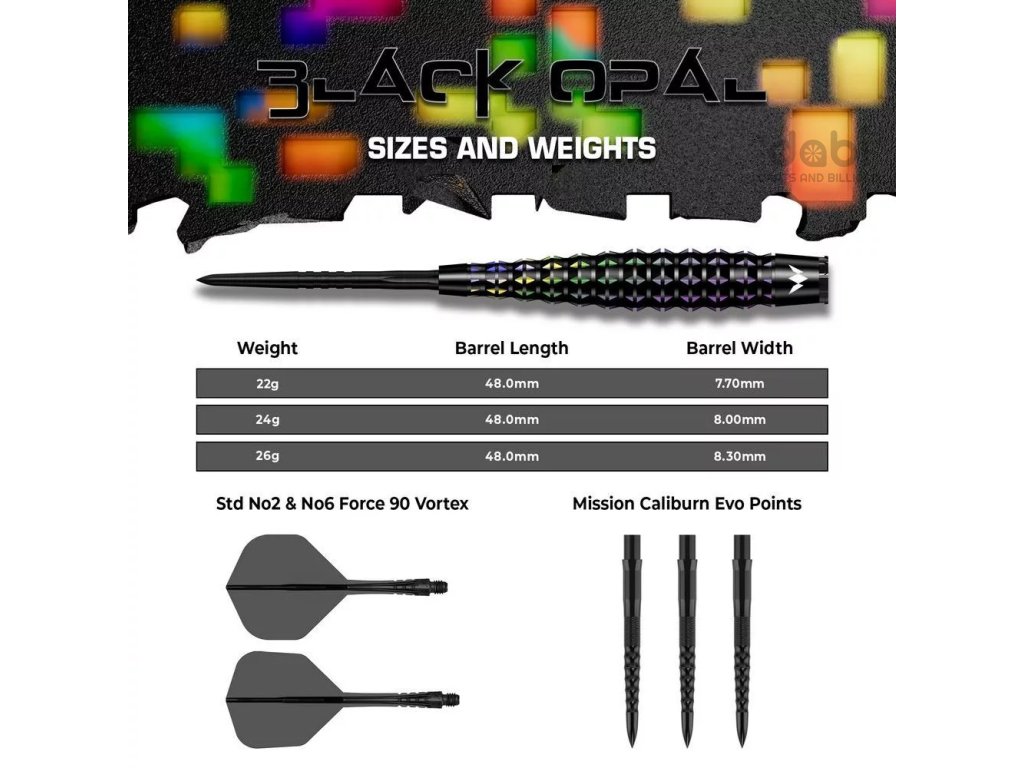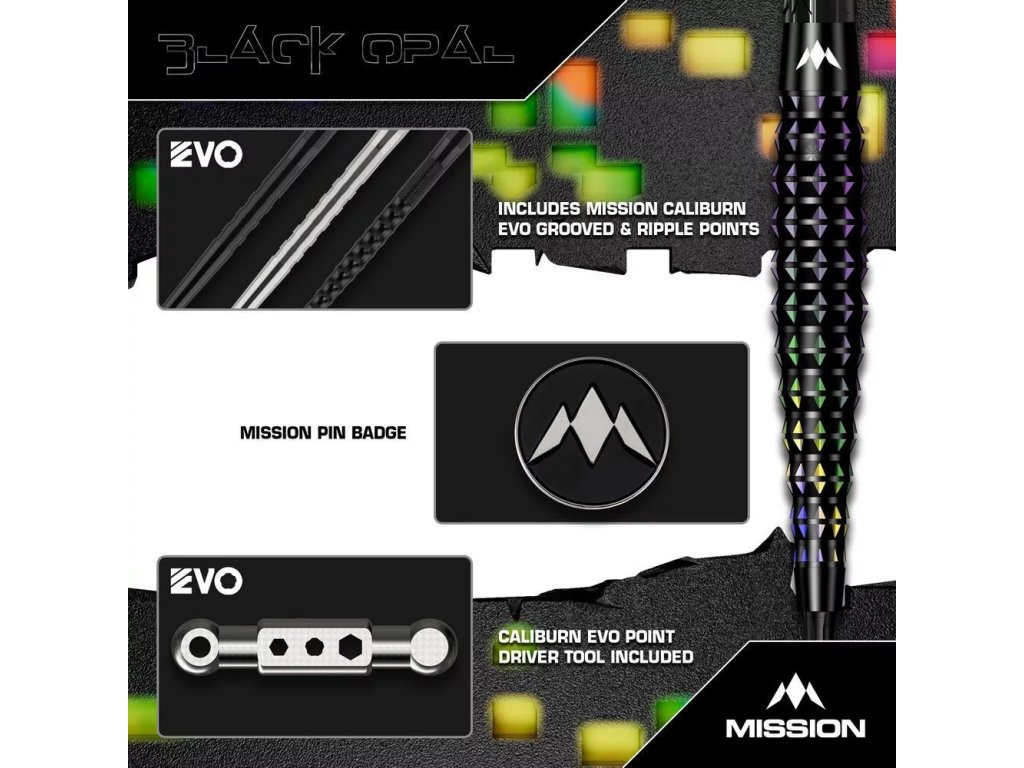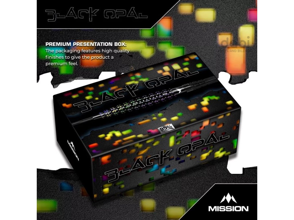 Dopřejte si prémiovou výbavu se šipkami Mission Black Opal. Tyto šipky, pojmenované po nejvzácnějším druhu opálu, jsou vyrobeny z vysoce kvalitního 95% wolframu. Na povrchu barelu mají efekt černého opálu, který je doplněn černým a korálovým PVD povlakem. Barel má frézované a malé radiální zářezy a výrazný černý a korálový PVD povlak téměř po celé délce, který vytváří efekt černého opálu s dobrou přilnavostí. V zadní části je malá hladká část s laserově leptaným logem Mission. Šipka Black Opal je dodávána se sadou průhledných černých letek Mission Force 90 Vortex. Šipka Mission Black Opal se dodává v dárkové krabičce, která obsahuje také dvě náhradní sady letek Mission Force 90 Vortex, náhradní hroty Caliburn EVO, nástroj pro nasazování hrotů Caliburn EVO a odznak Mission.