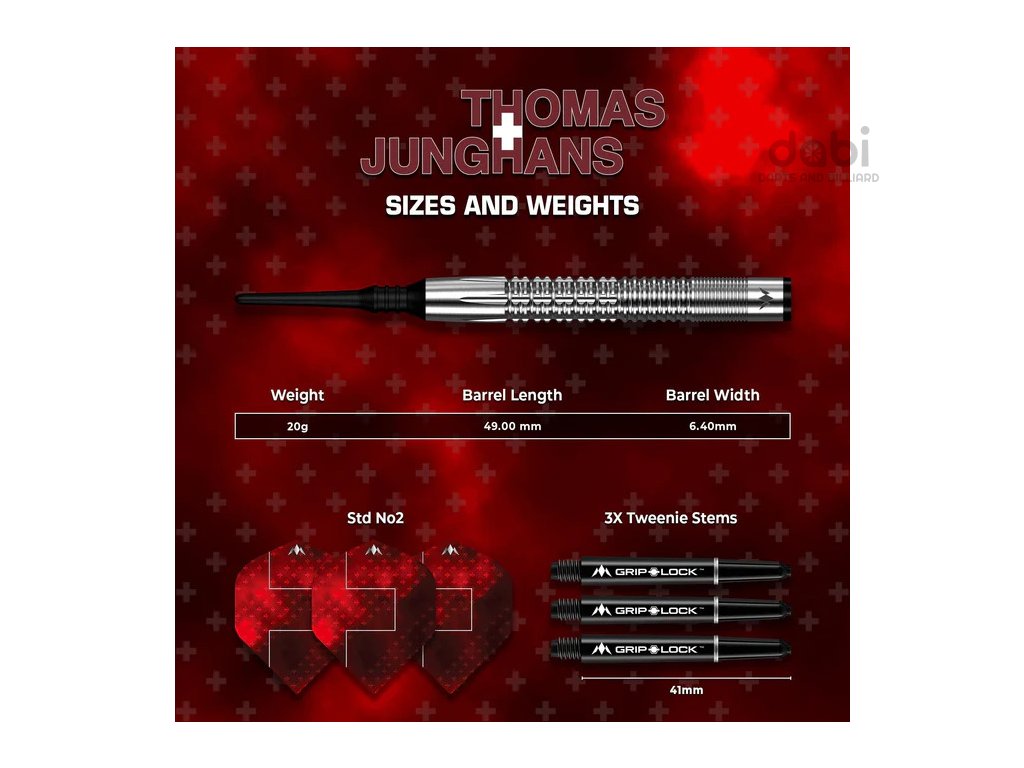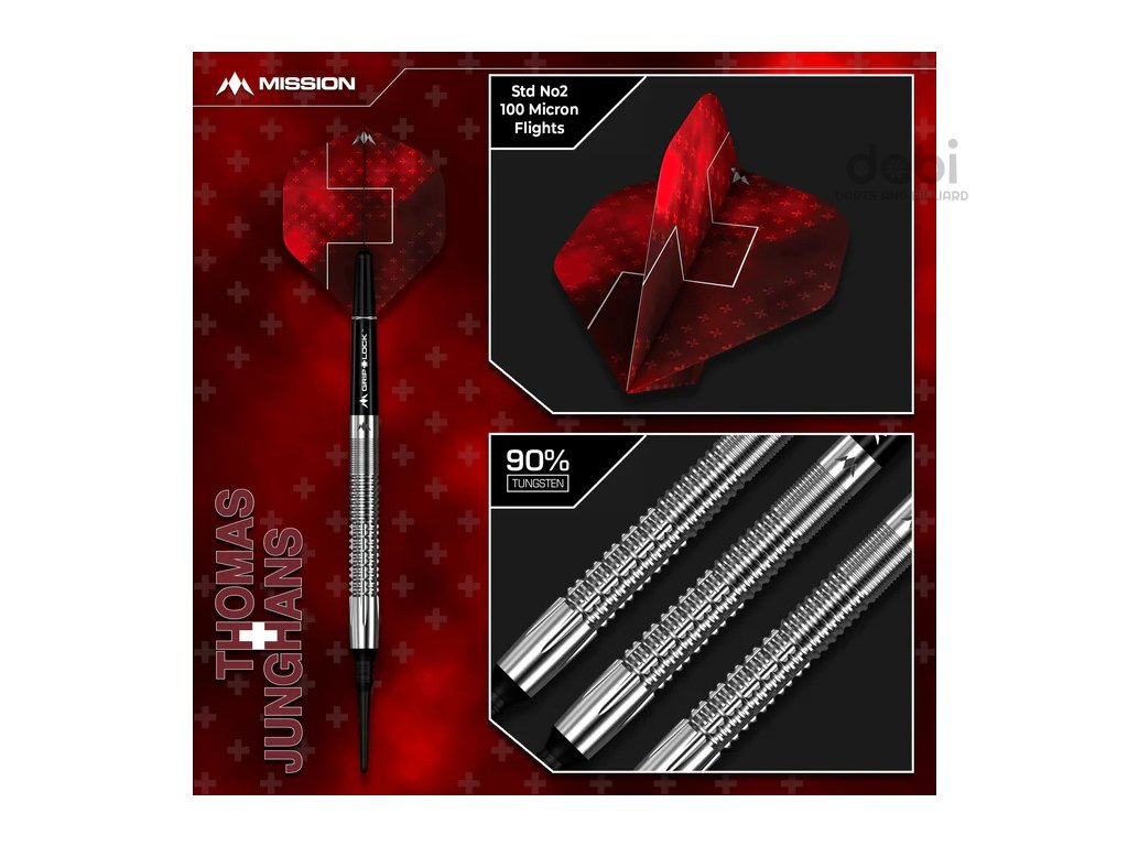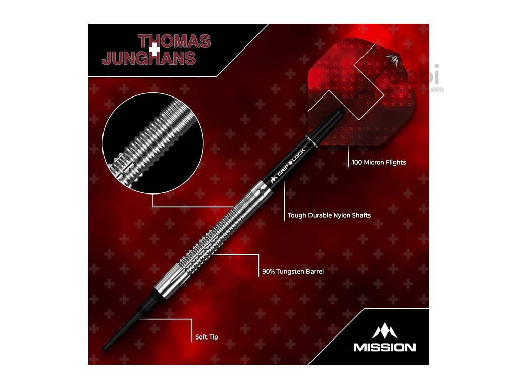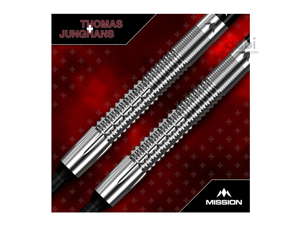 První sada signature šipek Junghans od Mission je vyrobena z 90% wolframu. Rovný barel má tři sekce s různými radiálními drážkami, které probíhají téměř po celé délce, včetně sekce frézovaných zářezů směrem k přední části. Zadní část barelu má malou hladkou část s laserem vyrytým logem Mission.