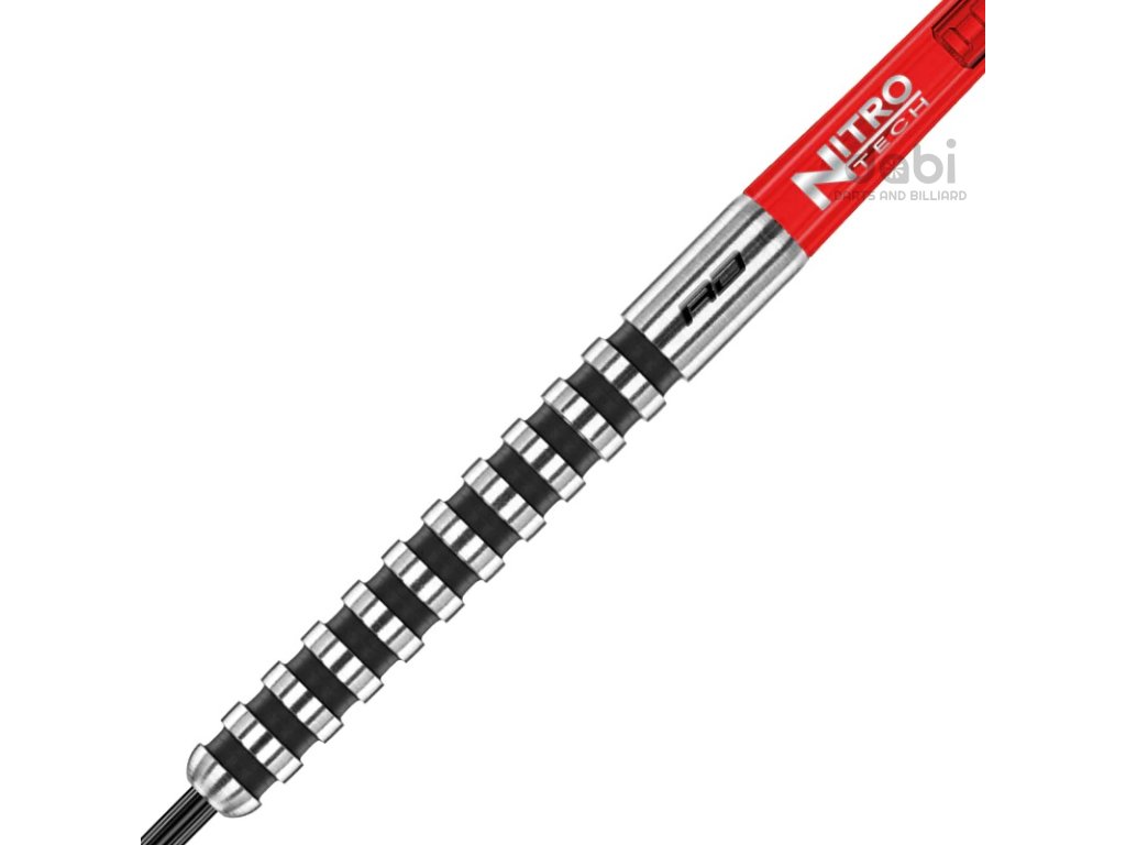 Delší rovný barel z 85% wolframu je proveden v černo-stříbrných barvách a má hrubý, ostrý grip.
