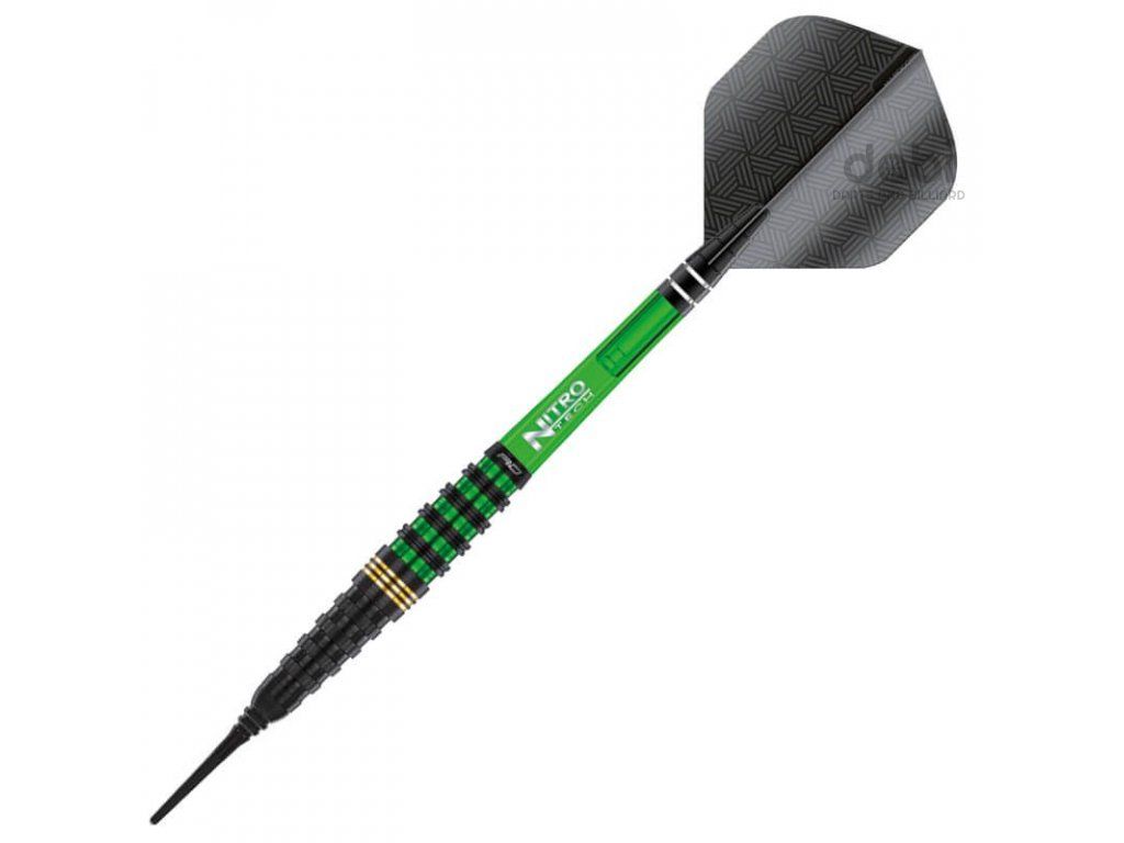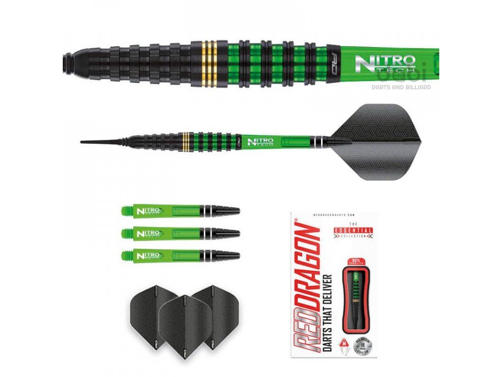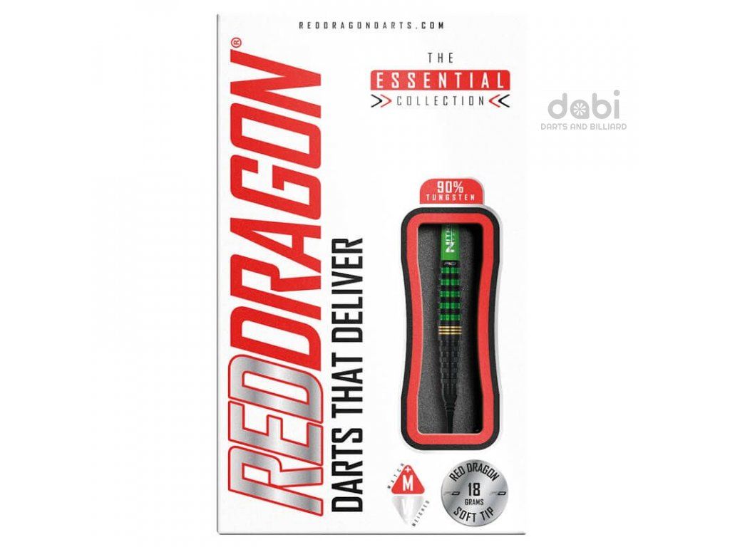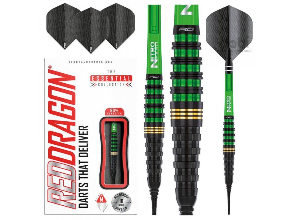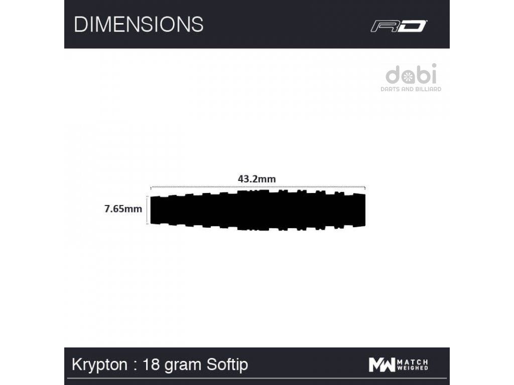 Softové šipky Red Dragon Krypton jsou 90% wolframové šipky s barely v moderním designu. Elegantní design spojený s vysoce výkonným torpédovitým profilem. Barel má po celé délce kroužkování, které přeměňuje pocit ve funkci. Černé barely zdobí zelené a zlaté proužky.