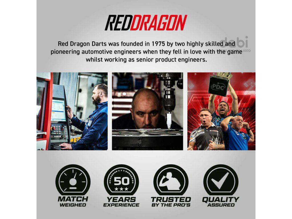 Značka Red Dragon Darts byla založena v roce 1975 dvěma vysoce kvalifikovanými a průkopnickými automobilovými inženýry, kteří se do hry zamilovali, když pracovali jako vedoucí produktoví inženýři. Brzy prozkoumali každý aspekt trhu s wolframem a rozhodli se zahájit výrobu wolframových šipek. I po více než čtyřech desetiletích se Red Dragon může pochlubit svým vlastním programem výroby wolframových šipek. Firma Red Dragon dodává své šipkové zboží do více než 100 zemí a od svého založení vyrobila miliony sad šipek. Peter WRIGHT, Gerwyn PRICE, Jonny CLAYTON, Luke HUMPHRIES, to jsou jména pevně spojená se značkou Red Dragon.