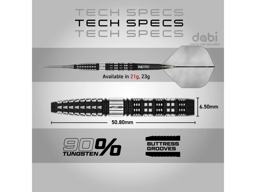 Šipka navržená s přesností, vyvážeností a smyslem. Kombinace výrazného černého a stříbrného stylu s pečlivým technickým frézováním. Každý prvek šipky Recon byl navržen s ohledem na účel a výkon. Šipka Recon, vyrobená z 90% wolframu, poskytuje unikátní úhlové frézování, vynikající profil úchopu, který hráčům poskytuje lepší kontrolu a jistotu při každém hodu. Dvoubarevná černá PVD a přírodní stříbrná povrchová úprava nejenže poskytují impozantní vzhled, ale také zvyšují životnost barelu.