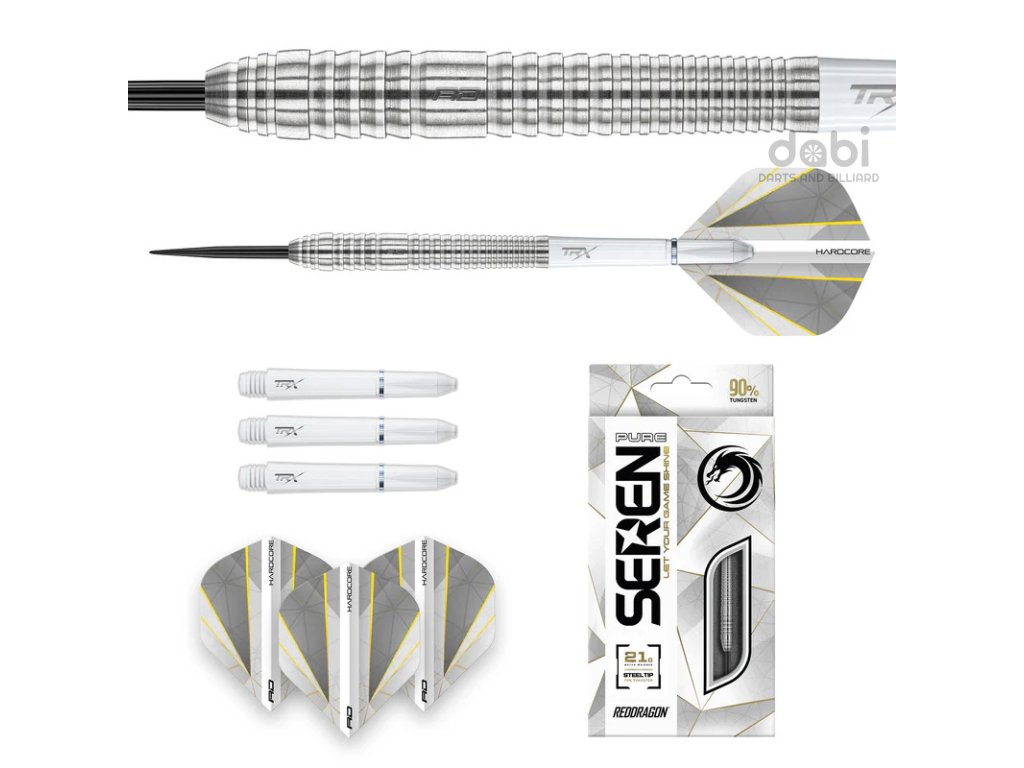 Šipky Seren Pure nabízejí čtyři různé profily barelu z 90% wolframu, z nichž každý je navržen tak, aby poskytoval flexibilitu úchopu a optimální výkon pro každého hráče. Seren Pure jsou v provedení s tradičním stříbrným povrchem.