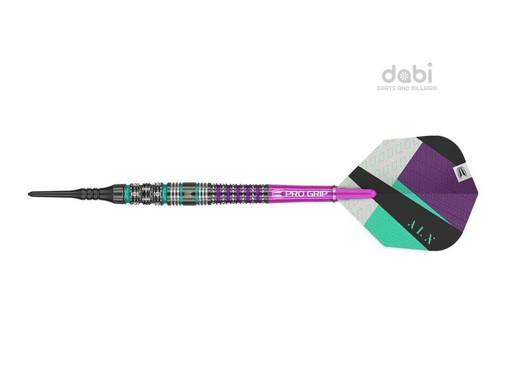 Řada ALX je navržena pro perfektní přilnavost a optimální vyvážení. Každý 90% wolframový barel nabízí přesné frézování po celé délce. Barel je osazen proužky v barevné kombinaci fialová/tyrkys s černým povlakem nitridu titanu.