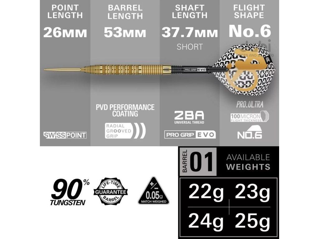 Šipky Bolide Envy kombinují moderní výkonnostní inženýrství s čistým, precizně zaměřeným designem a vytvářejí všestranné řešení. Barel modelu 01 je vyroben z 90 % wolframu. Vyznačuje se přesnými radiálními drážkami, které zajišťují konzistentní úchop, vyváženou kontrolu a plynulé hody.