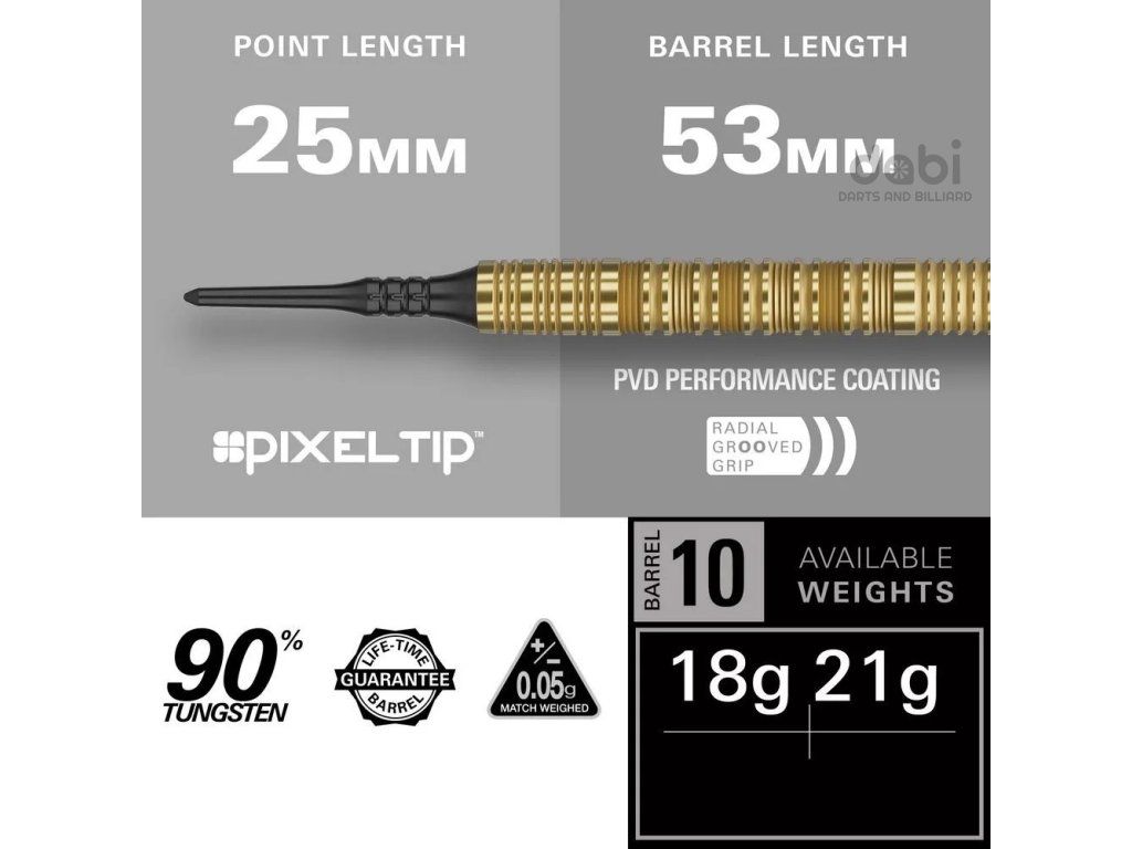 Šipky Bolide Envy kombinují moderní výkonnostní inženýrství s čistým, precizně zaměřeným designem a vytvářejí všestranné řešení. Barel modelu 10 je vyroben z 90 % wolframu. Vyznačuje se přesnými radiálními drážkami, které zajišťují konzistentní úchop, vyváženou kontrolu a plynulé hody.