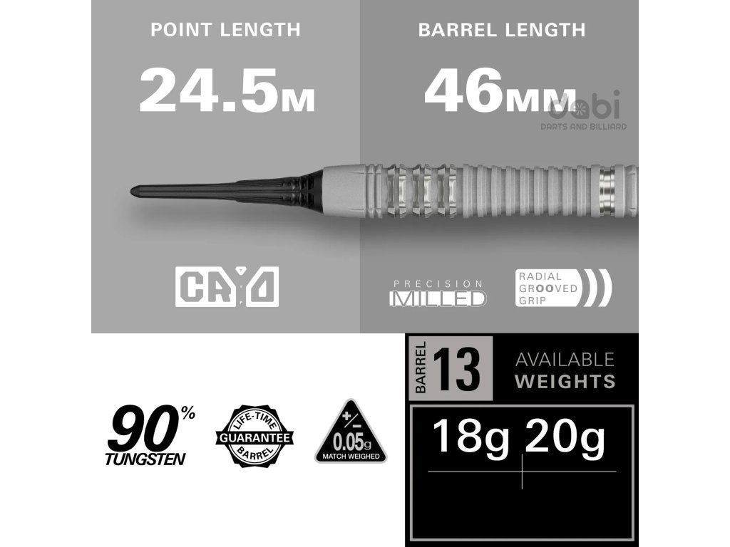 Barel šipky Cryo je vyroben z 90 % wolframu a prochází vícestupňovým procesem přesné výroby. Rozsáhlé frézování a radiální drážky vytvářejí detailní texturu úchopu, zatímco pískování celého povrchu dodává rafinovanou mikrotexturu. Barel je poté znovu opracován, aby se zvýraznila jeho definice, a nakonec je opatřeno šedým PVD povlakem, který zajišťuje odolnost a prémiový matný povrch.