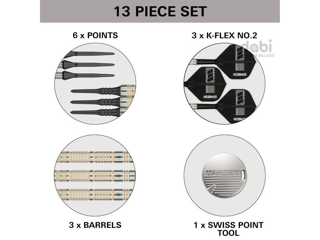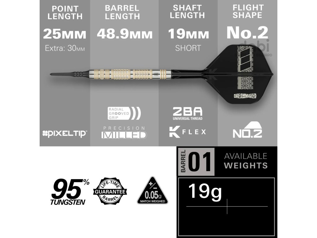 Rovný barel je vyroben z 95% wolframu a navržen je tak, aby poskytoval vyvážený pocit pro konzistentní házení. Malá přední část je opatřena jemnými radiálními drážkami, zatímco střední část přechází do precizně frézovaných čtvercových zářezů pro spolehlivou konzistenci úchopu. Tělo je opatřeno pískovanou texturou a chráněno zirkoniovým PVD povlakem, který mu dodává odolnost a nápadný moderní vzhled.