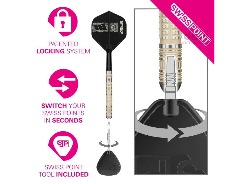 Hroty Swiss Points jsou kompatibilní pouze s barely Target Darts Swiss Point a nelze je kombinovat s běžnými hroty pro nalisování ani s hroty se závitem 2BA.