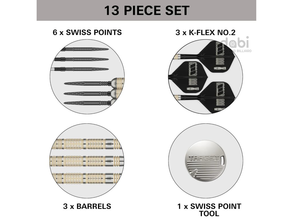 Hroty Swiss Points jsou kompatibilní pouze s barely Target Darts Swiss Point a nelze je kombinovat s běžnými hroty pro nalisování ani s hroty se závitem 2BA.