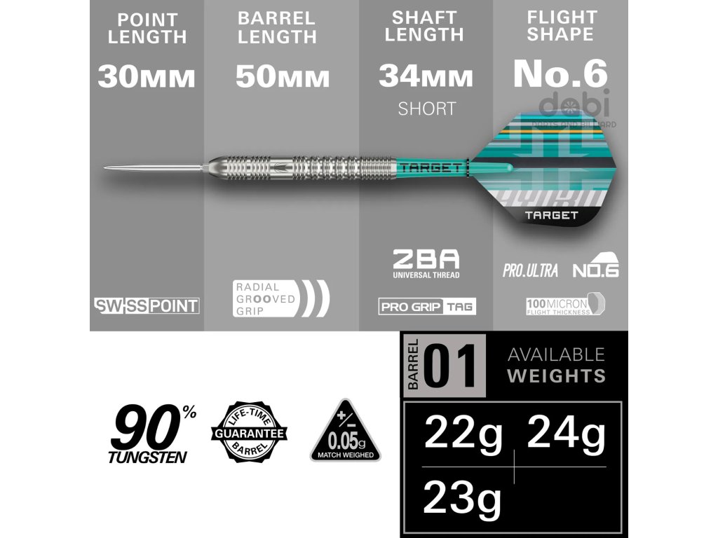Šipky Hydro Swiss Point jsou inspirovány přesností a konzistencí pohybu plynulého jako voda. Jsou navrženy tak, aby poskytovaly plynulý hod se zvýšenou přilnavostí a kontrolou. Barely z 90 % wolframu mají jemně frézované radiální drážky a tvarované výřezy, které kombinují moderní estetiku s hmatovým pocitem.