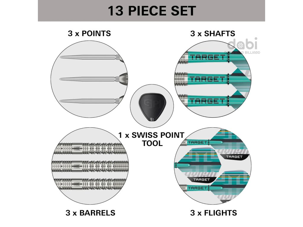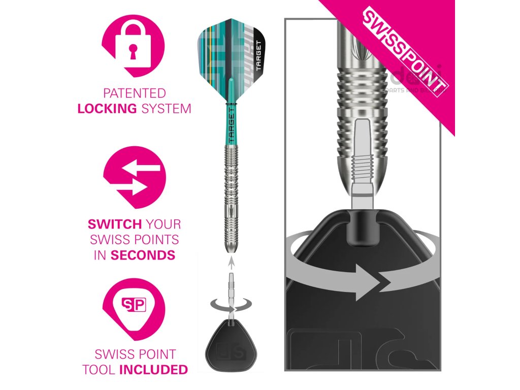 Šipky Hydro Swiss Point jsou inspirovány přesností a konzistencí pohybu plynulého jako voda. Jsou navrženy tak, aby poskytovaly plynulý hod se zvýšenou přilnavostí a kontrolou. Barely z 90 % wolframu mají jemně frézované radiální drážky a tvarované výřezy, které kombinují moderní estetiku s hmatovým pocitem.
