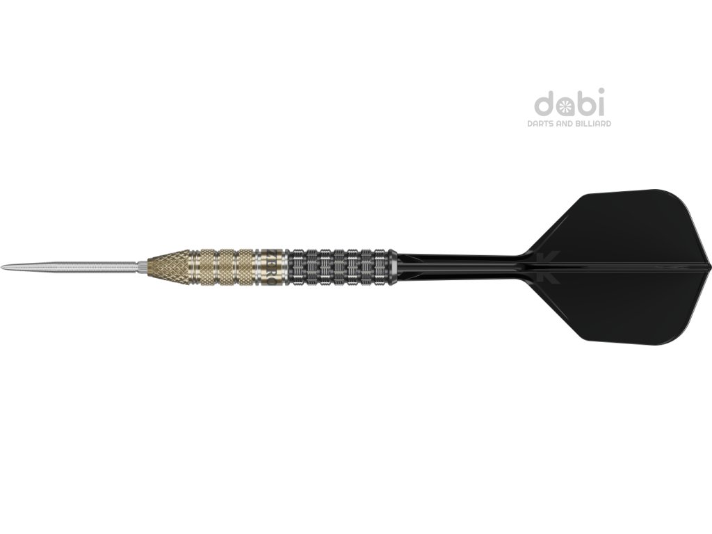 Rovný barel z 90% wolframu je proveden v barevné kombinaci zlatá/stříbrná/černá. Barel má po celé délce jemně ostrý neklouzavý grip.