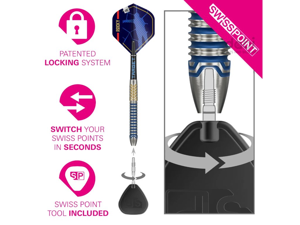 Hroty Swiss Points jsou kompatibilní pouze s barely Target Darts Swiss Point a nelze je kombinovat s běžnými hroty pro nalisování ani s hroty se závitem 2BA.