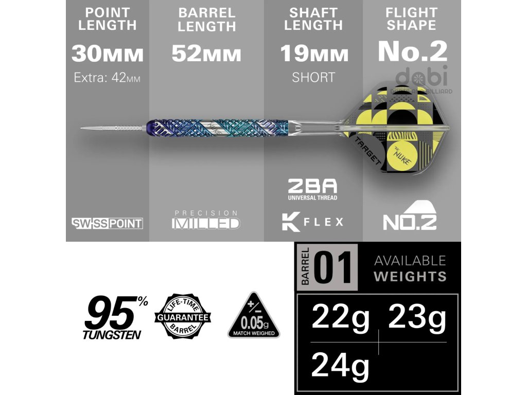 Každý barel je vyroben z 95 % wolframu a je kompletně frézován pomocí CNC technologie, díky čemuž poskytuje vícesměrný úchop. Barely jsou opatřeny modrým DLC povlakem, který jim dodává výjimečnou odolnost a živý, duhový vzhled. Vybrané úchopové zóny jsou opakovaně opracovány, aby vynikla kontrastní textura pro lepší hmatovou kontrolu, zatímco Lukovo charakteristické logo „NUKE“ je laserem vyryto do středu, čímž dotváří exkluzivní design této šipky.