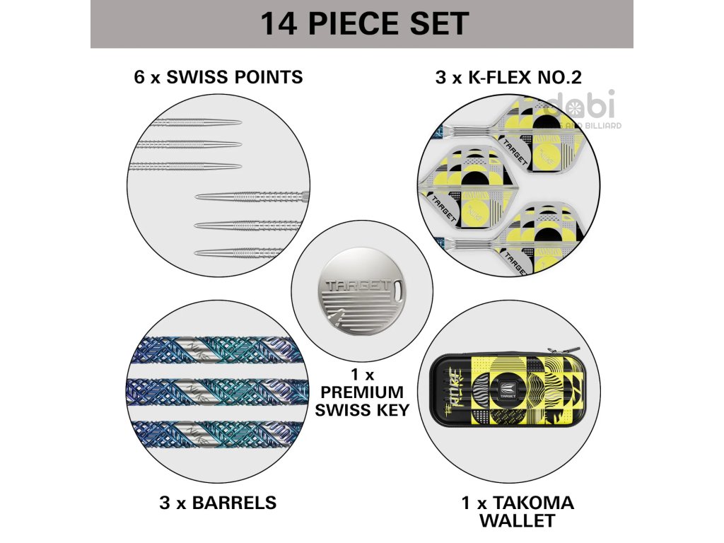 Sada obsahuje 30mm hroty Swiss Fire Points a další sadu 42mm hrotů, což hráčům umožňuje přizpůsobit si nastavení podle osobních preferencí. Díky systému Swiss Point lze hroty rychle a bezpečně vyměnit pomocí přiloženého stříbrného nástroje Swiss keyring, který nabízí pohodlí a přizpůsobivost pro maximální výkon.