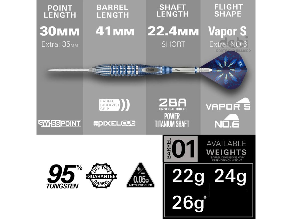 Barel šipky je vyroben z 95 % wolframu a má klasický torpédový tvar s předním vyvážením pro hladký a konzistentní odhoz. Úchop Quattro kombinuje CNC obrábění s frézovanými čtvercovými řezy, čímž vytváří charakteristickou texturu, kterou zdůrazňuje elektricky modrý povlak z nitridu titanu.