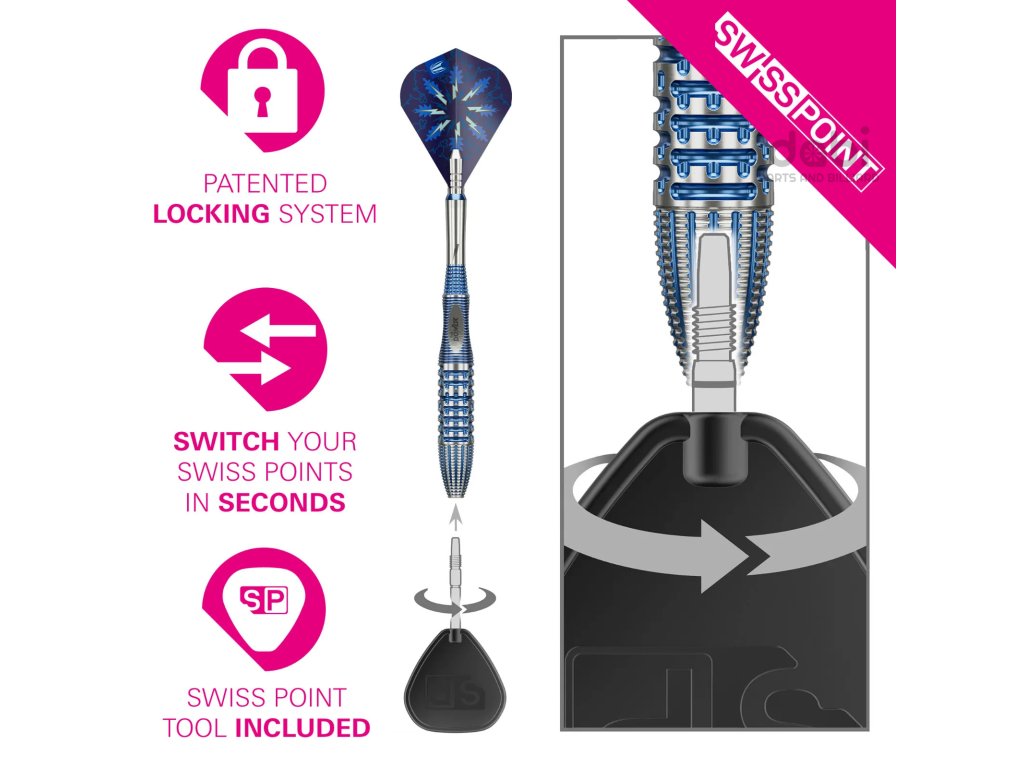 Hroty Swiss Points jsou kompatibilní pouze s barely Target Darts Swiss Point a nelze je kombinovat s běžnými hroty pro nalisování ani s hroty se závitem 2BA.