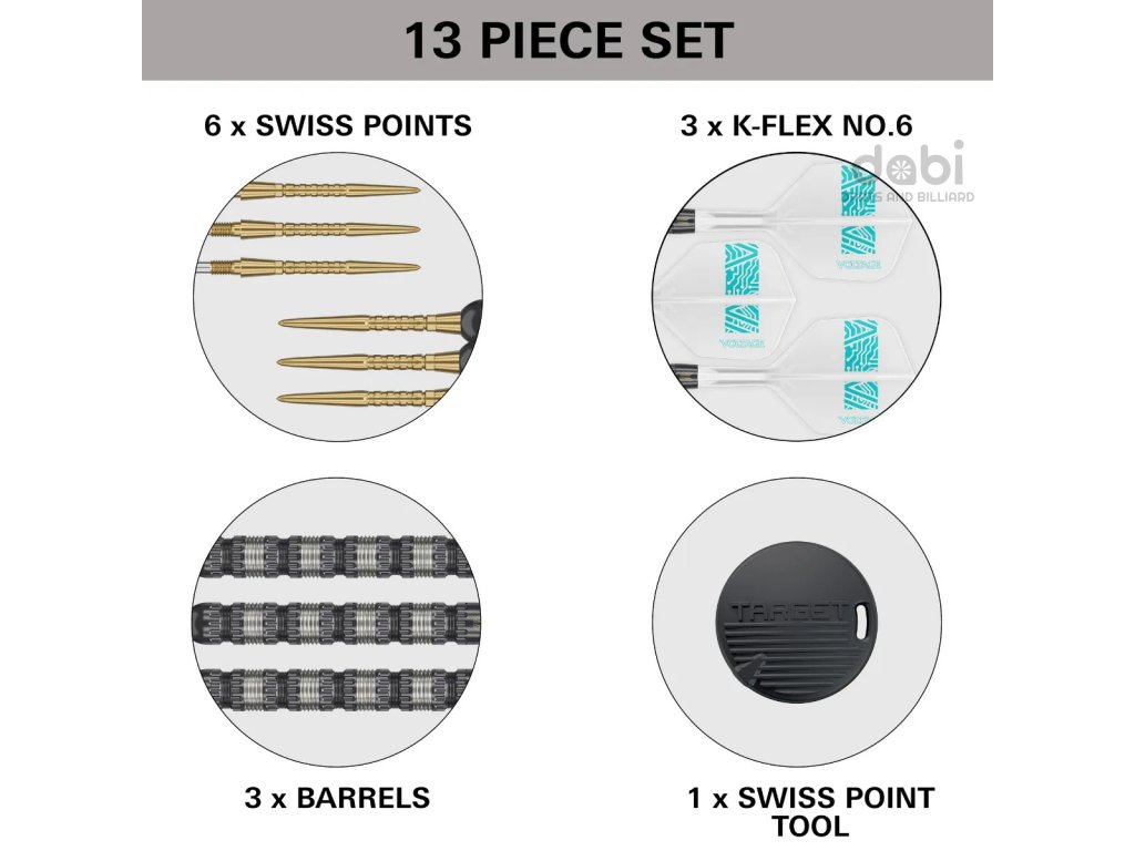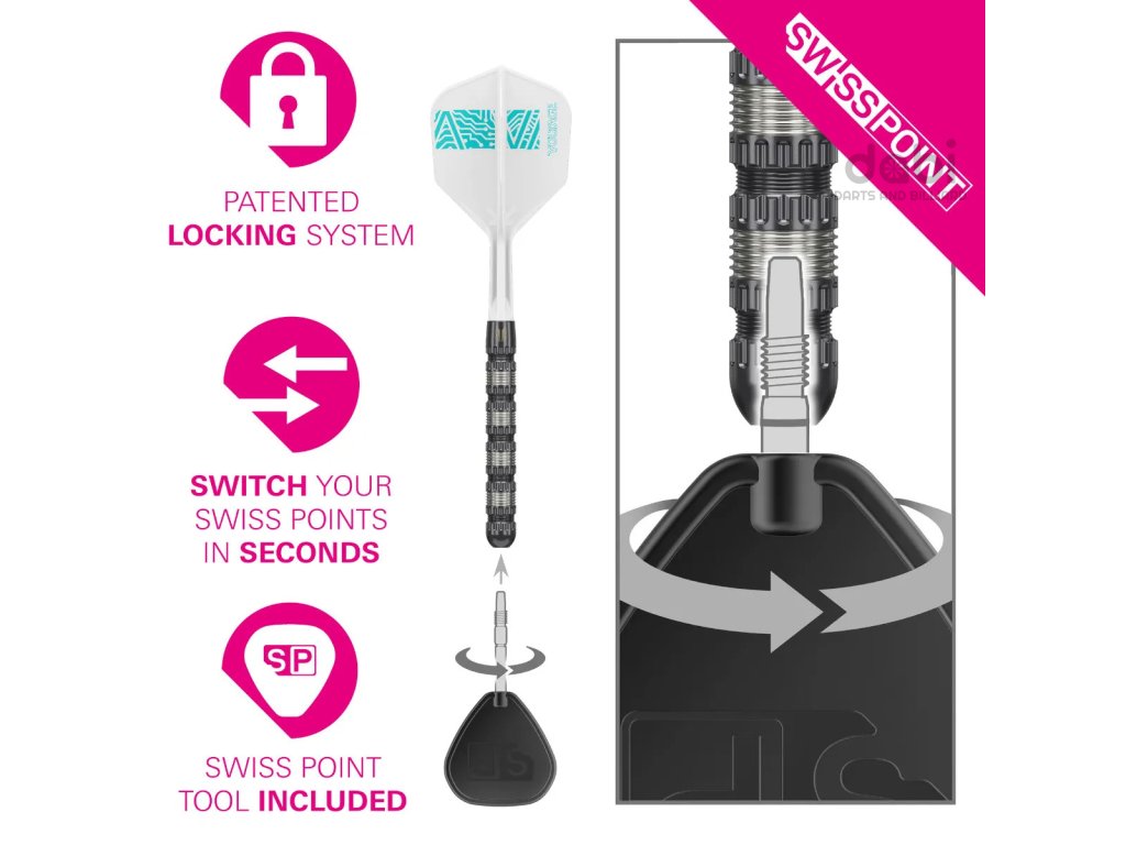 Hroty Swiss Points jsou kompatibilní pouze s barely Target Darts Swiss Point a nelze je kombinovat s běžnými hroty pro nalisování ani s hroty se závitem 2BA.