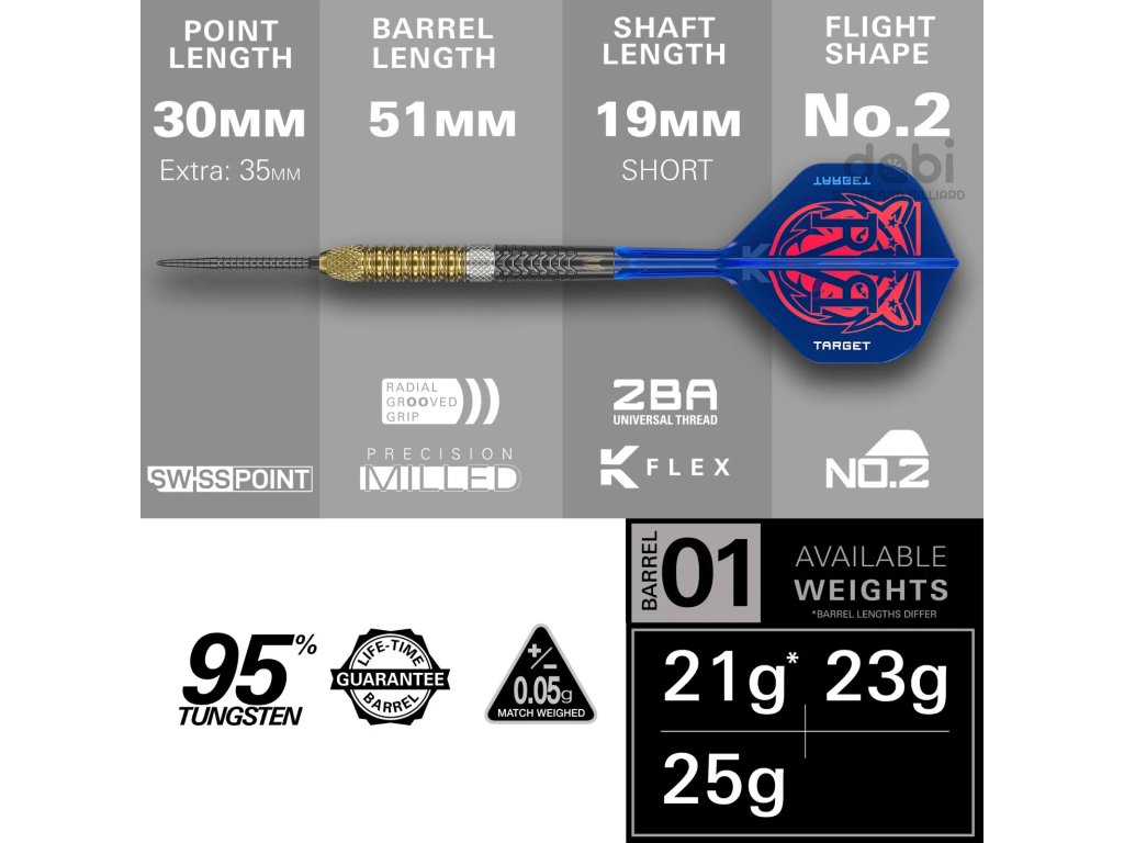 Barel šipky je vyroben z 95 % wolframu a vyznačuje se vysokou hustotou. Je opatřen precizně frézovaným diamantovým vzorem, který plynule přechází do čistých radiálních drážek. Bohatý povlak z titaničitanu zlata nejen zvyšuje estetickou hodnotu, ale také posiluje odolnost proti opotřebení. V zadní části poskytuje jemně frézovaný axiální vzorek lepší kontrolu hráčům, kteří preferují držení šipky více vzadu.
