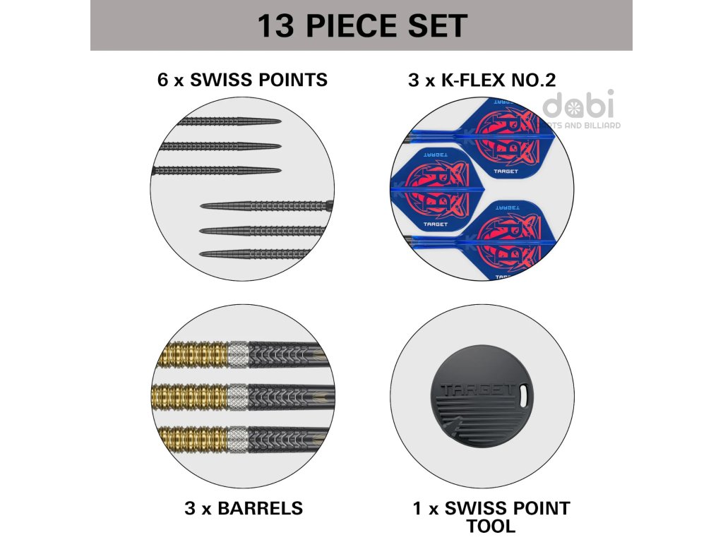 Hroty Swiss Points jsou kompatibilní pouze s barely Target Darts Swiss Point a nelze je kombinovat s běžnými hroty pro nalisování ani s hroty se závitem 2BA.