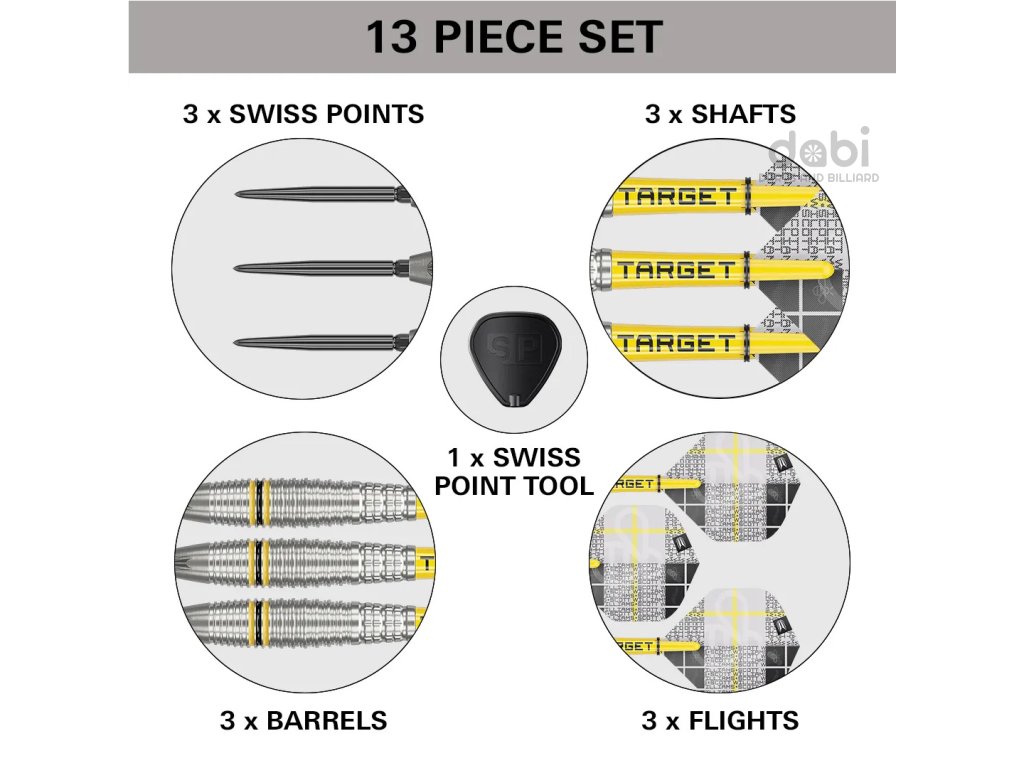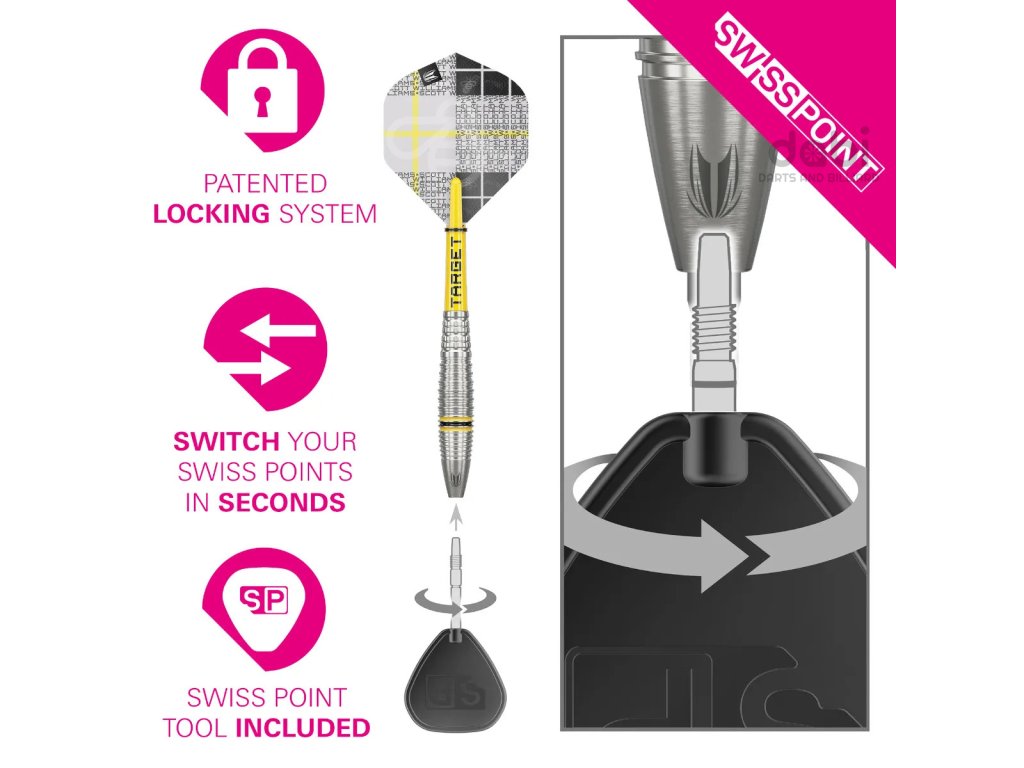 Hroty Swiss Points jsou kompatibilní pouze s barely Target Darts Swiss Point a nelze je kombinovat s běžnými hroty pro nalisování ani s hroty se závitem 2BA.