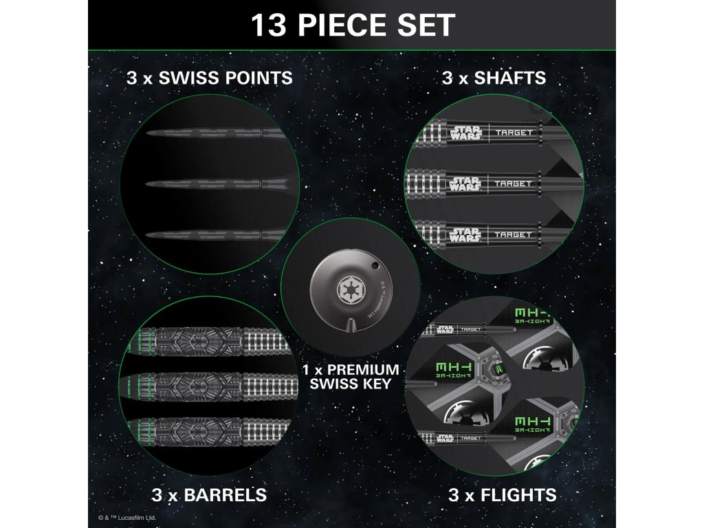 Šipky Tie Fighter jsou vybaveny hroty Onyx Swiss Storm Points od společnosti Target a využívají patentovanou technologii Swiss Point, která zaručuje bezpečné uchycení a rychlou výměnu pomocí přiloženého nástroje Swiss Point. Hroty jsou opatřeny matnou černou povrchovou úpravou, která odráží nenápadnost a sofistikovanost flotily Impéria, a poskytují profesionální spolehlivost a dokonalý kontakt s terčem.