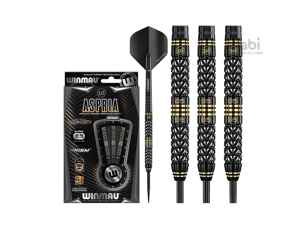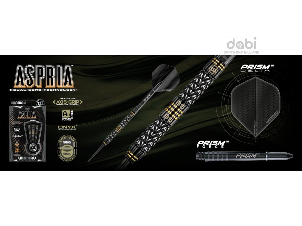 Profesionální šipky od firmy Winmau s novým typem gripu Axis a dvojím obsahem wolframu v barelu. Aspria Dual Core, přesně propracovaný barel, používá Axis Grip a nejnovější CAD CAM technologii obrábění. Vyrobeno z jedinečných dvoujádrových bloků společnosti Winmau, obsahujících 95/85 % wolframu, tvoří novou éru designu šipek, řemeslného zpracování a výkonu. Zakončeno originálním pozlacením a povlakem Onyx.