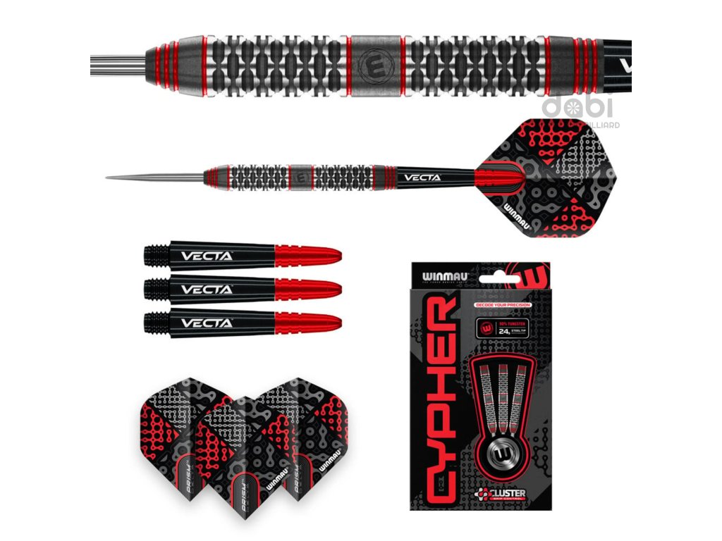 Šipky Cypher mají barel z 90% wolframu. Je na nich použit po celé délce barelu Cluster-Grip Control, který je navržen pro skvělé úchopové možnosti. Jejich paralelní profil je vyroben z vysoce přesného, atomově optimalizovaného wolframu, který poskytuje dokonalou rovnováhu a efektivní dynamiku.