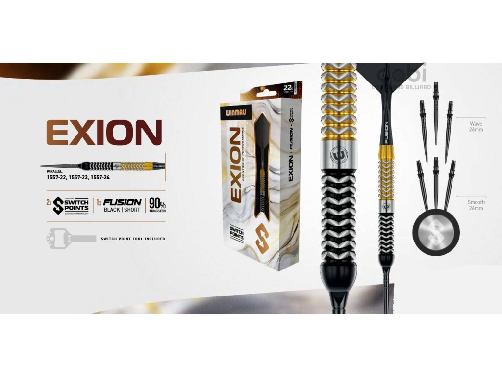 Exion je šipka v charakteristické černo-zlato-černé kompozici barelu šipky. Drážkovaný frézovaný blokový vzor poskytuje konzistentní zóny úchopu, což hráčům dává jistý a opakovatelný úchop. Dvojitá černá a zlatá povrchová úprava umocňuje styl a přesnost. Šipka je vybavena inovativními systémy Fusion a Switch Point od společnosti Winmau. Technologie Fusion zlepšuje kontrolu nad hody a odolnost, zatímco Switch Points umožňují rychlé a bezpečné výměny hrotu během několika sekund.